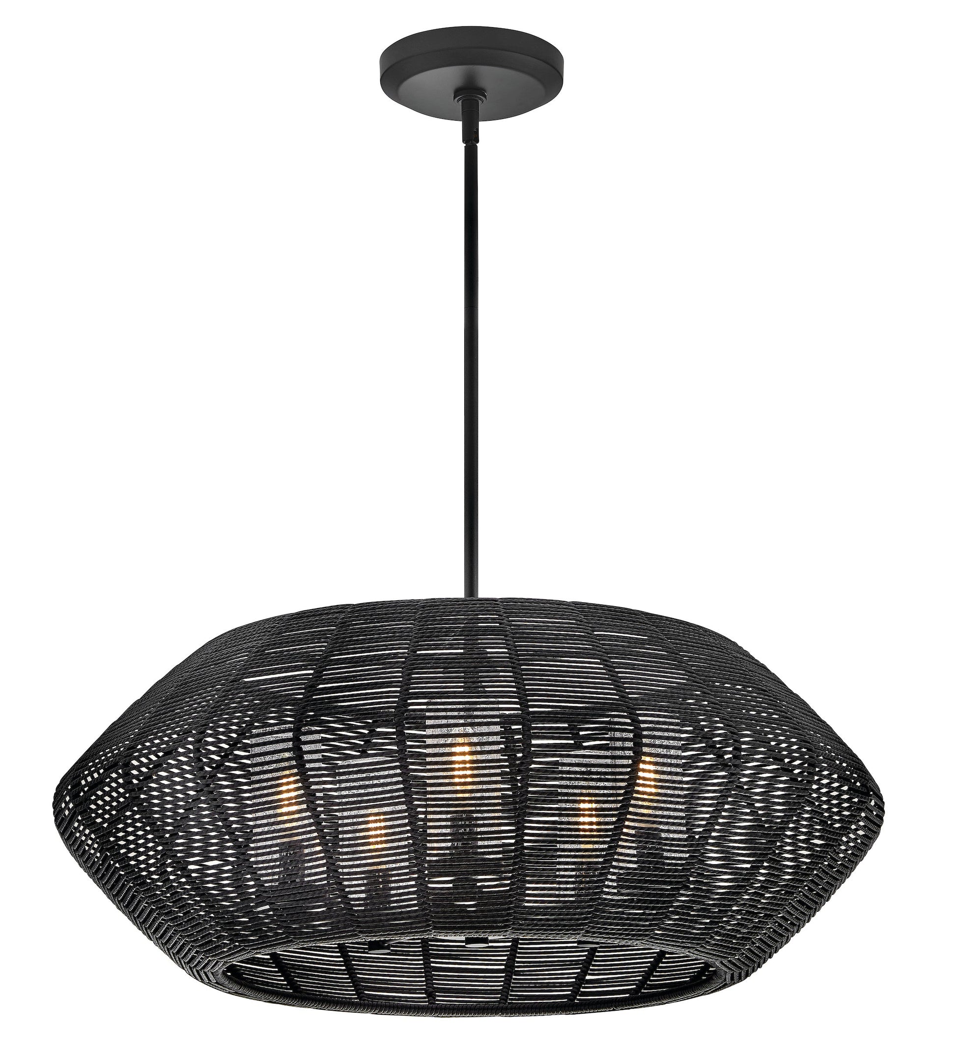 Luca's coastal vibe is permeated with a slightly exotic edge. The bold silhouette showcases a robust, weather-resistant, woven drum shade and candelabra lamps enclosed in clear, seedy glass for plenty of functional light. Offered in a variety of finish options. Luca is part of the Lisa McDennon Collection.