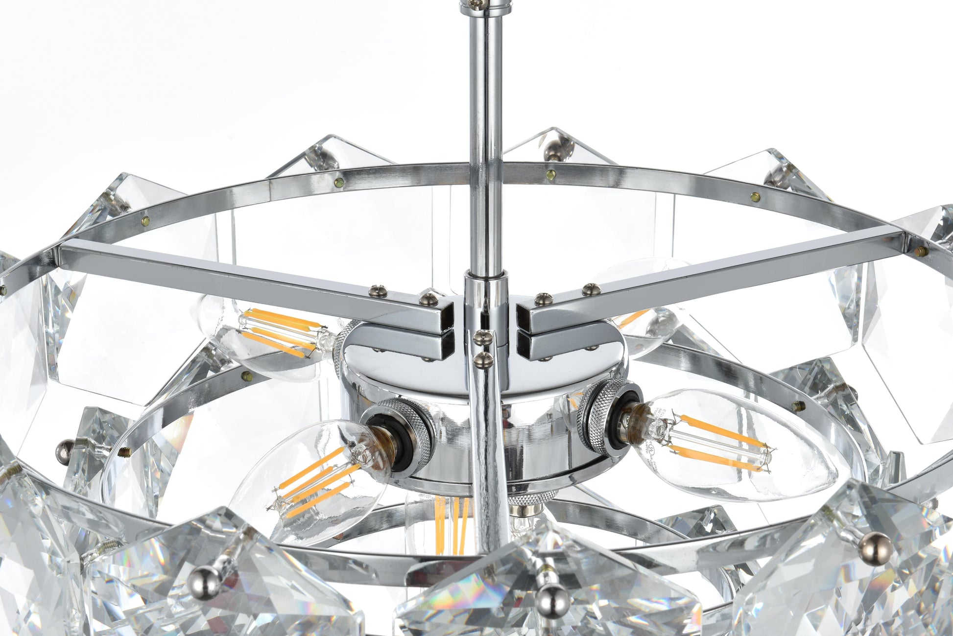 Transform your space with this cascading multi-tier pendant light that combines striking design with meticulous craftsmanship. Crafted from a sturdy iron frame and adorned with six-sided faceted crystals, this lighting piece exudes charm through its ability to diffuse light into a soft, radiant glow. With finishes available in both sleek chrome for a contemporary feel and satin gold for a warmer, refined touch, it complements a range of decor styles. The adjustable height, from 19 inches to 79 inches with the included 59-inch chain, ensures it fits seamlessly in any setting. Equipped with six E12 sockets and dimmable functionality, you can customize the lighting to suit your mood or occasion. Its matching canopy and chain finish complete the cohesive design, making it perfect for kitchens, dining rooms, living rooms, or offices. A statement piece that transforms your space into a work of art, this pendant is the perfect blend of style and functionality.
