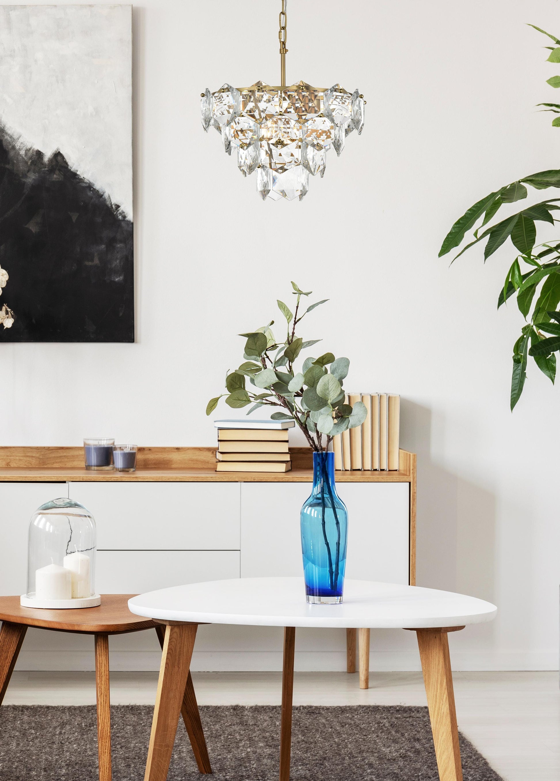 Transform your space with this cascading multi-tier pendant light that combines striking design with meticulous craftsmanship. Crafted from a sturdy iron frame and adorned with six-sided faceted crystals, this lighting piece exudes charm through its ability to diffuse light into a soft, radiant glow. With finishes available in both sleek chrome for a contemporary feel and satin gold for a warmer, refined touch, it complements a range of decor styles. The adjustable height, from 19 inches to 79 inches with the included 59-inch chain, ensures it fits seamlessly in any setting. Equipped with six E12 sockets and dimmable functionality, you can customize the lighting to suit your mood or occasion. Its matching canopy and chain finish complete the cohesive design, making it perfect for kitchens, dining rooms, living rooms, or offices. A statement piece that transforms your space into a work of art, this pendant is the perfect blend of style and functionality.