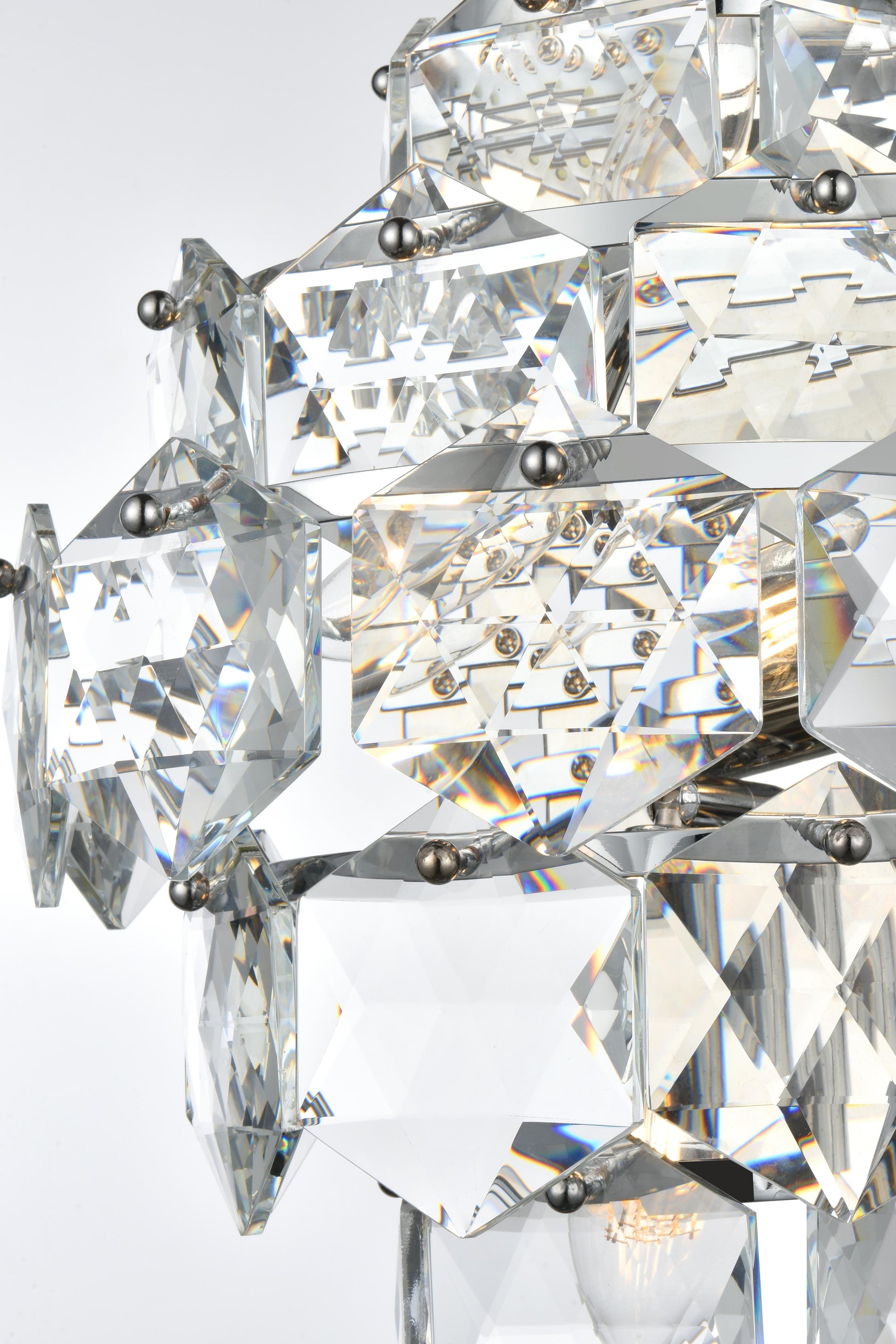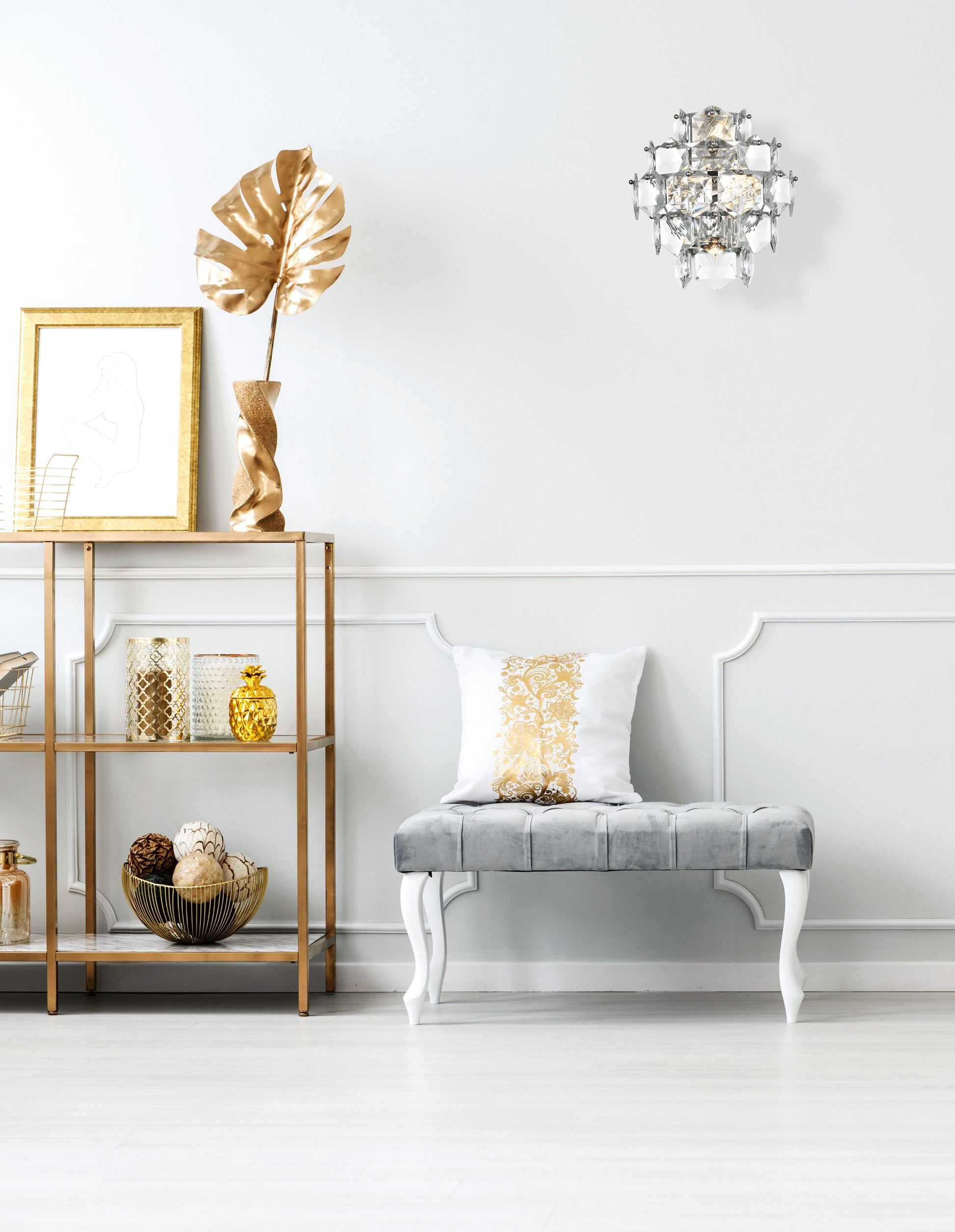 Add a touch of sophistication and shine to your space with this cascading crystal wall sconce light. Designed with a multi-tier arrangement of six-sided faceted crystals, this fixture creates a mesmerizing interplay of light and shadow, making it a standout addition to any room. Its sturdy iron frame is paired with your choice of a chrome finish for a sleek, modern aesthetic or satin gold for a warm, opulent feel. The fixture includes four E12 sockets (bulbs sold separately) and is fully dimmable, giving you the ability to set the perfect ambiance. The matching canopy finish completes the cohesive look. Compact yet visually impactful, this wall sconce is ideal for hallways, dining rooms, living rooms, bedrooms, or offices, offering both functional illumination and a dazzling decorative element.