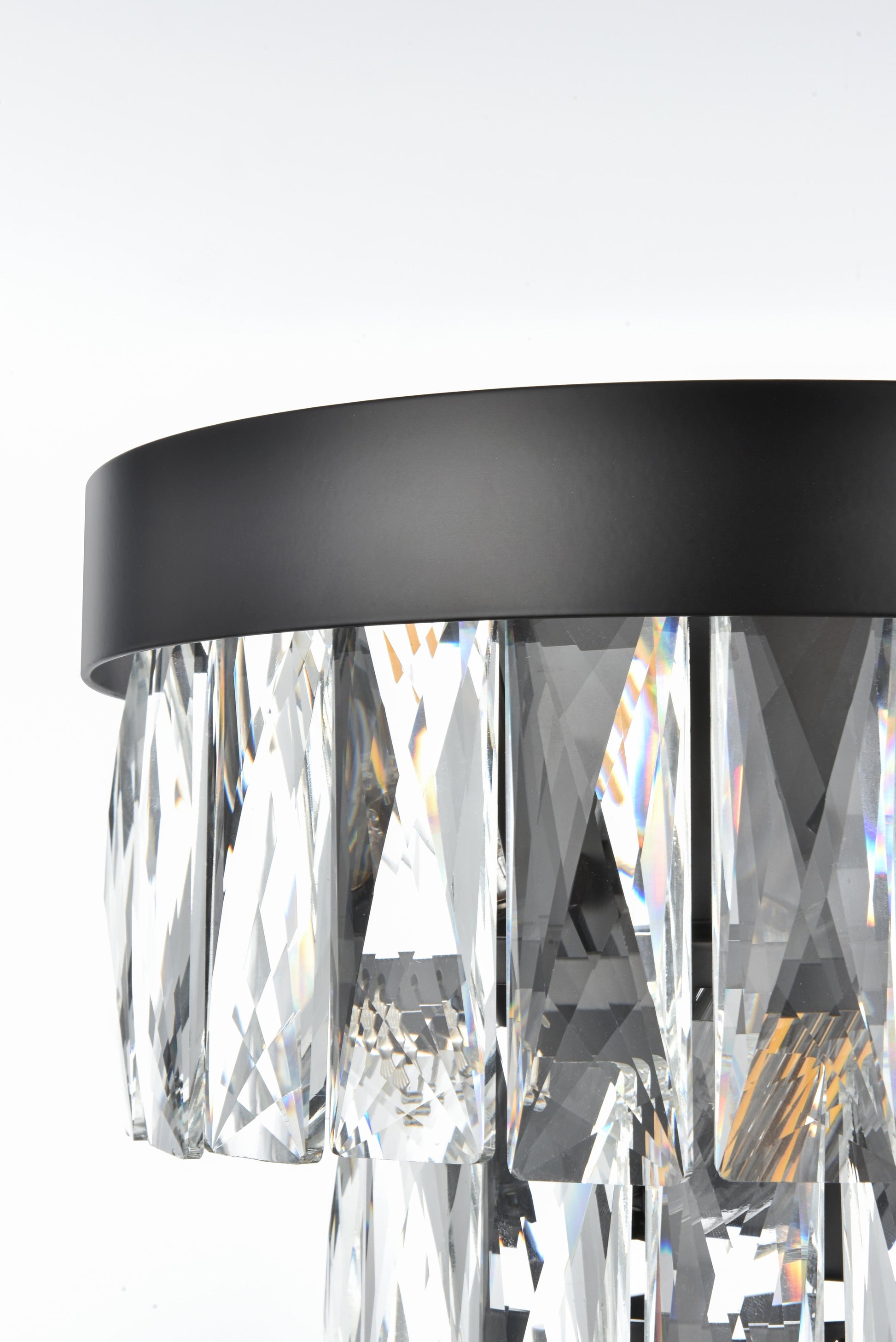 Transform your space with this extraordinary wall sconce that reimagines classical crystal design for contemporary interiors. The masterfully engineered silhouette features three graduating tiers that create a spectacular inverted pyramid, reminiscent of a frozen cascade captured in mid-descent. Each precisely cut rectangular crystal is strategically positioned to maximize light play, creating mesmerizing displays of fractured light throughout your space. The thoughtful construction incorporates 2 light sources distributed throughout the tiers, ensuring both spectacular illumination and enchanting crystal animation. The robust iron framework provides a secure foundation while maintaining visual lightness, allowing the crystals to appear as if floating in space. Available in reflective chrome, sophisticated black, or warm satin gold, this pendant makes an unforgettable statement while maintaining refined restraint. The cascading arrangement creates a sense of movement and flow, while the geometric precision of each crystal adds contemporary edge to the classical form. This is more than a light fixture – it's an architectural feature that transforms your space through its commanding presence and spectacular light performance.