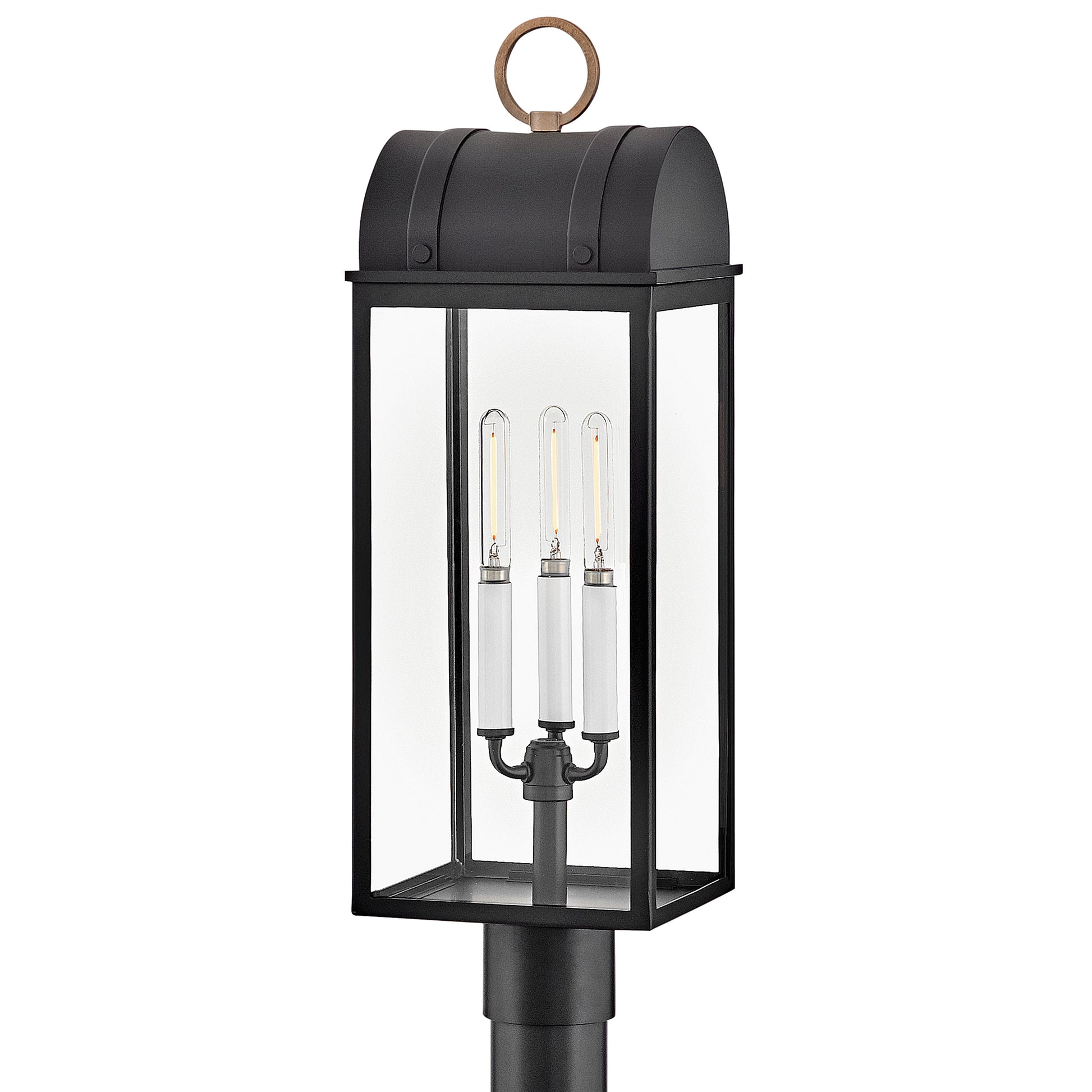 Inspired by traditional colonial lanterns, Campbell’s carriage house styling complements classic architecture accentuated by a bold arched roof and a cast top ring. Candelabra lamps with contrasting candle sleeves are enhanced by a Black with Burnished Bronze finish.