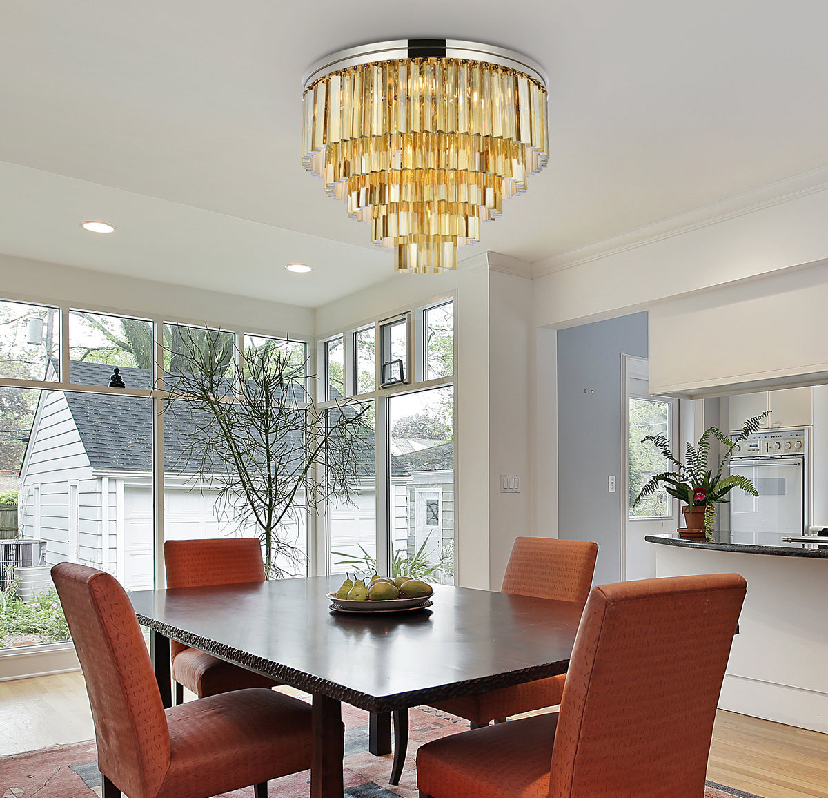 Timeless splendor and modern refinement are brought together in flush-mount Sydney fixtures. Dazzling in dining rooms, staircases, or hallways, the Sydney collection flaunts stunning tiers of royal-cut crystals in clear, golden teak, or Silver shade. A circular mocha-brown or polished-nickel finished steel frame adds understated charm to this stunning flush-mount lamp.