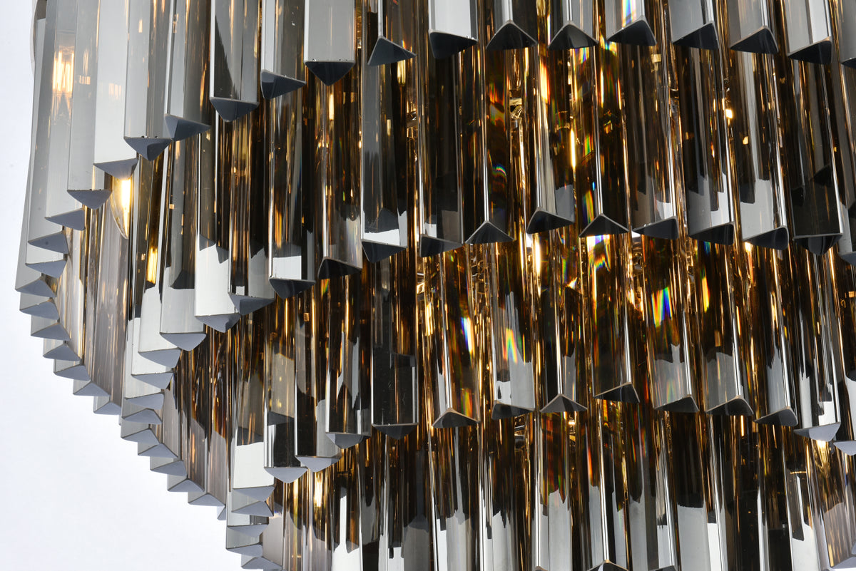 Timeless splendor and modern refinement are brought together in flush-mount Sydney fixtures. Dazzling in dining rooms, staircases, or hallways, the Sydney collection flaunts stunning tiers of royal-cut crystals in clear, golden teak, or Silver shade. A circular mocha-brown or polished-nickel finished steel frame adds understated charm to this stunning flush-mount lamp.