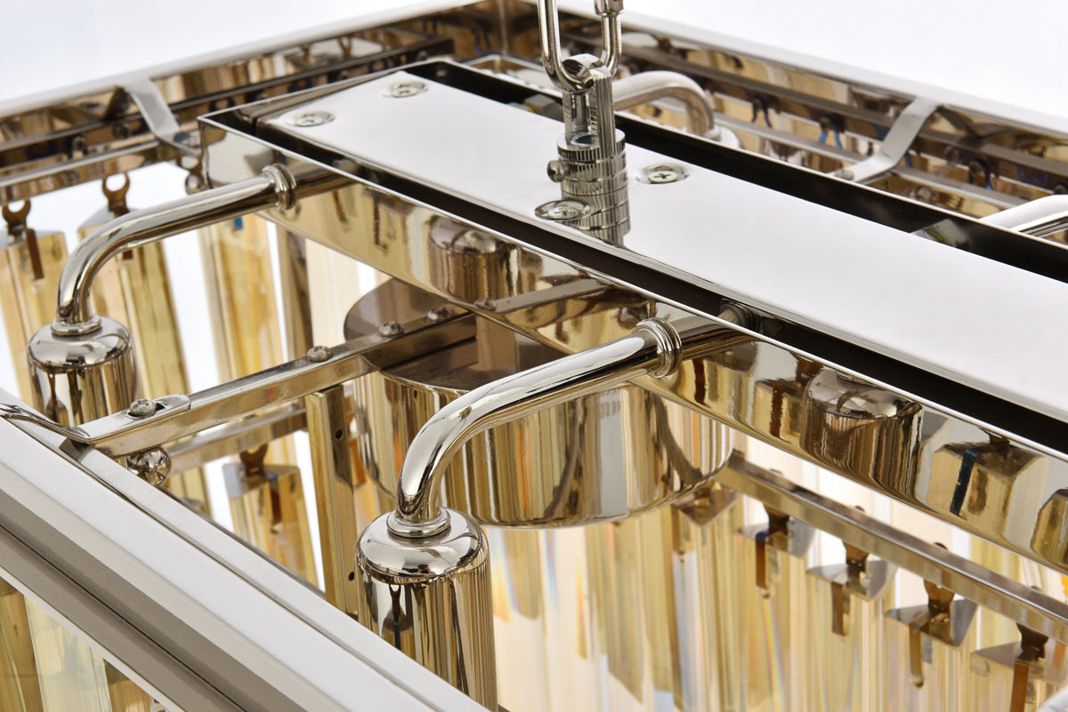 Bring the splendor of the ballroom into your home with a sparkling Sydney fixture. Stunning in foyers, dining rooms, or stairwells, the Sydney collection brings to mind the glamour of the Roaring Twenties. Features glimmering tiers of royal-cut clear, golden-teak, or Silver-shade crystals. In mocha-brown or polished-nickel finishes, this sturdy, yet delicate, pendant lamp will be the perfect centerpiece for any décor.