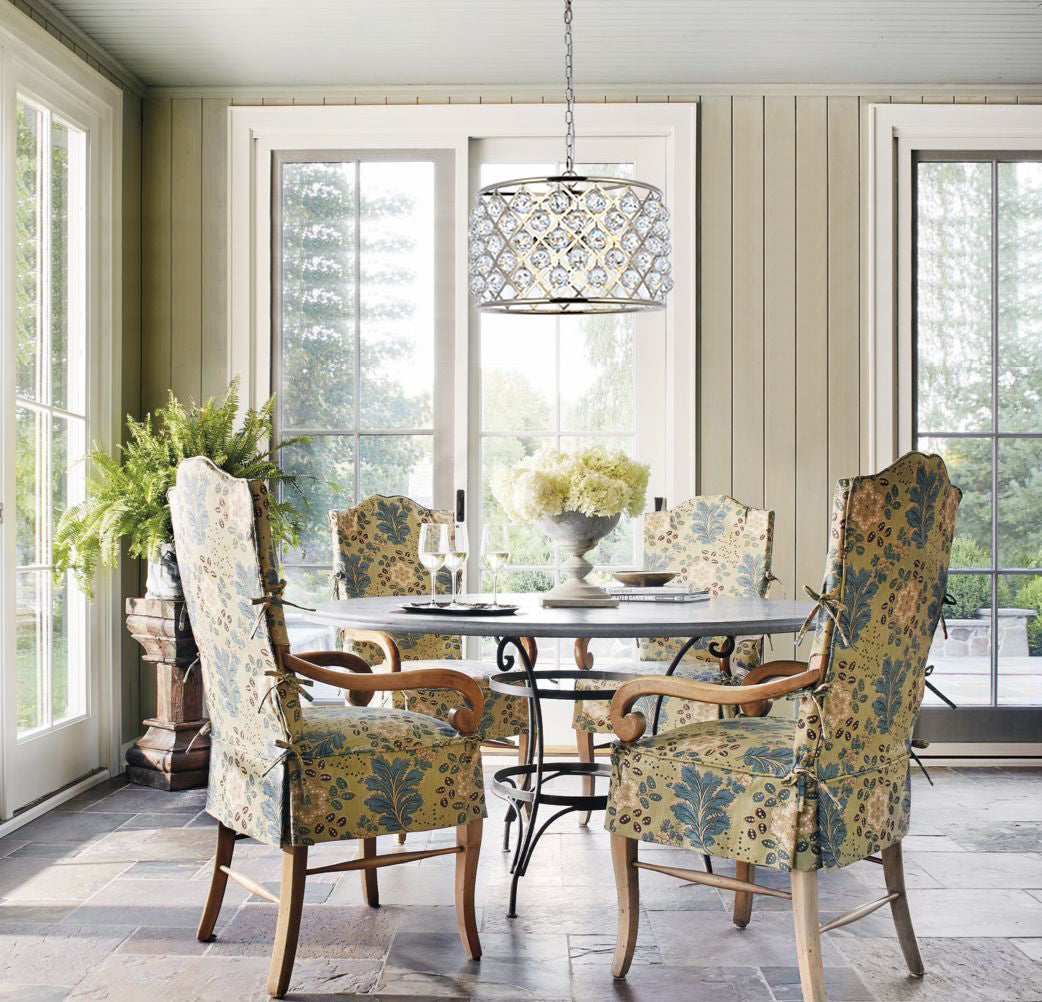 Modern simplicity meets organic beauty in the breathtakingly unique Madison collection. Hand-polished, multifaceted clear, golden-teak, or Silver-shade crystal spheres shimmer like dewdrops in a circular forged-iron grid with a golden-iron, mocha-brown, or polished-nickel finish. These airy pendant lamps will brighten up a kitchen, dining room, foyer, or stairwell in an explosion of reflected light.