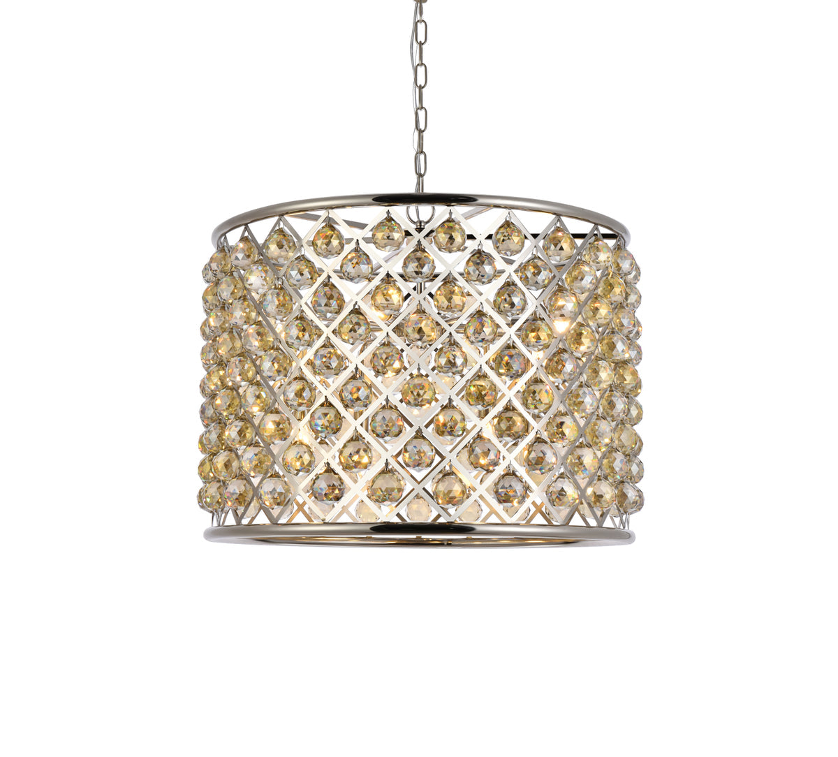 Modern simplicity meets organic beauty in the breathtakingly unique Madison collection. Hand-polished, multifaceted clear, golden-teak, or Silver-shade crystal spheres shimmer like dewdrops in a circular forged-iron grid with a golden-iron, mocha-brown, or polished-nickel finish. These airy pendant lamps will brighten up a kitchen, dining room, foyer, or stairwell in an explosion of reflected light.
