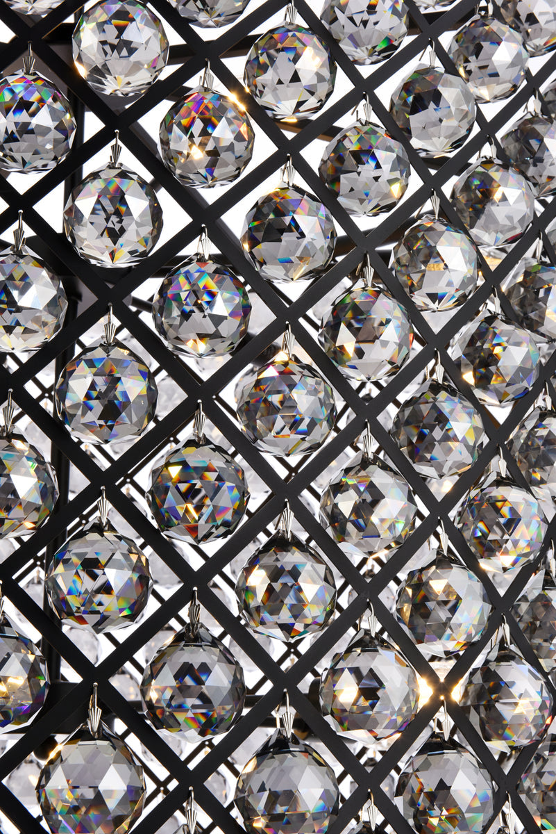 Modern simplicity meets organic beauty in the breathtakingly unique Madison collection. Hand-polished, multifaceted clear, golden-teak, or Silver-shade crystal spheres shimmer like dewdrops in a circular forged-iron grid with a golden-iron, Matte Black, or polished-nickel finish. These airy pendant lamps will brighten up a kitchen, dining room, foyer, or stairwell in an explosion of reflected light.