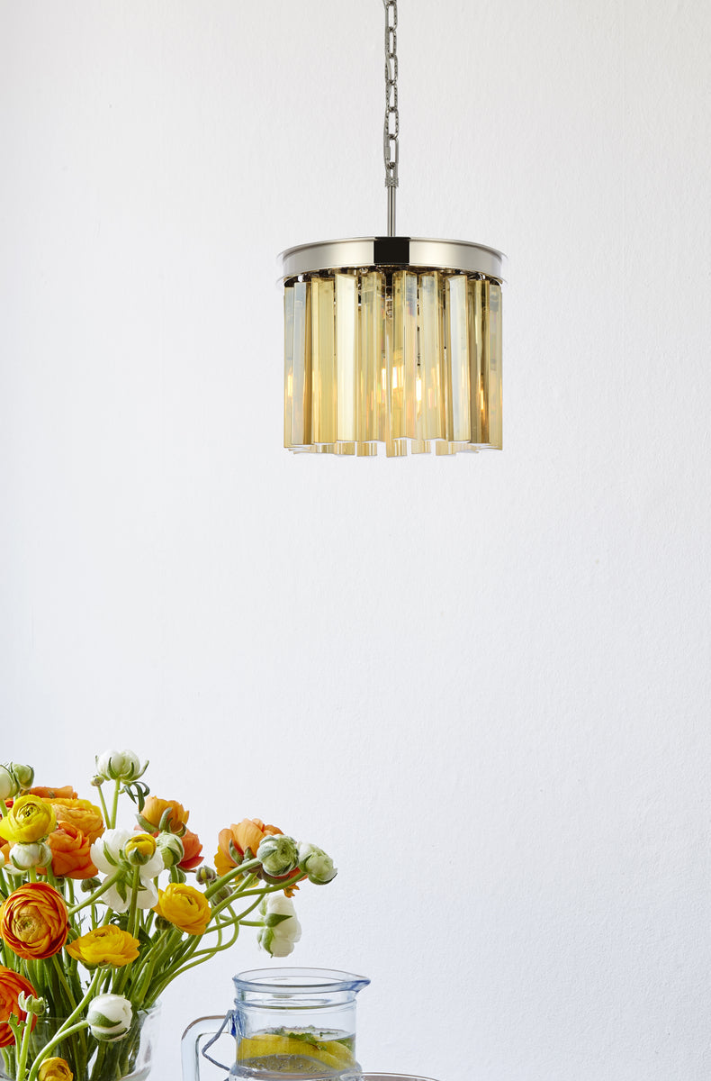 Bring the splendor of the ballroom into your home with a sparkling Sydney fixture. Stunning in foyers, dining rooms, or stairwells, the Sydney collection brings to mind the glamour of the Roaring Twenties. Features glimmering tiers of royal-cut clear, golden-teak, or Silver-shade crystals. In mocha-brown or polished-nickel finishes, this sturdy, yet delicate, pendant lamp will be the perfect centerpiece for any décor.