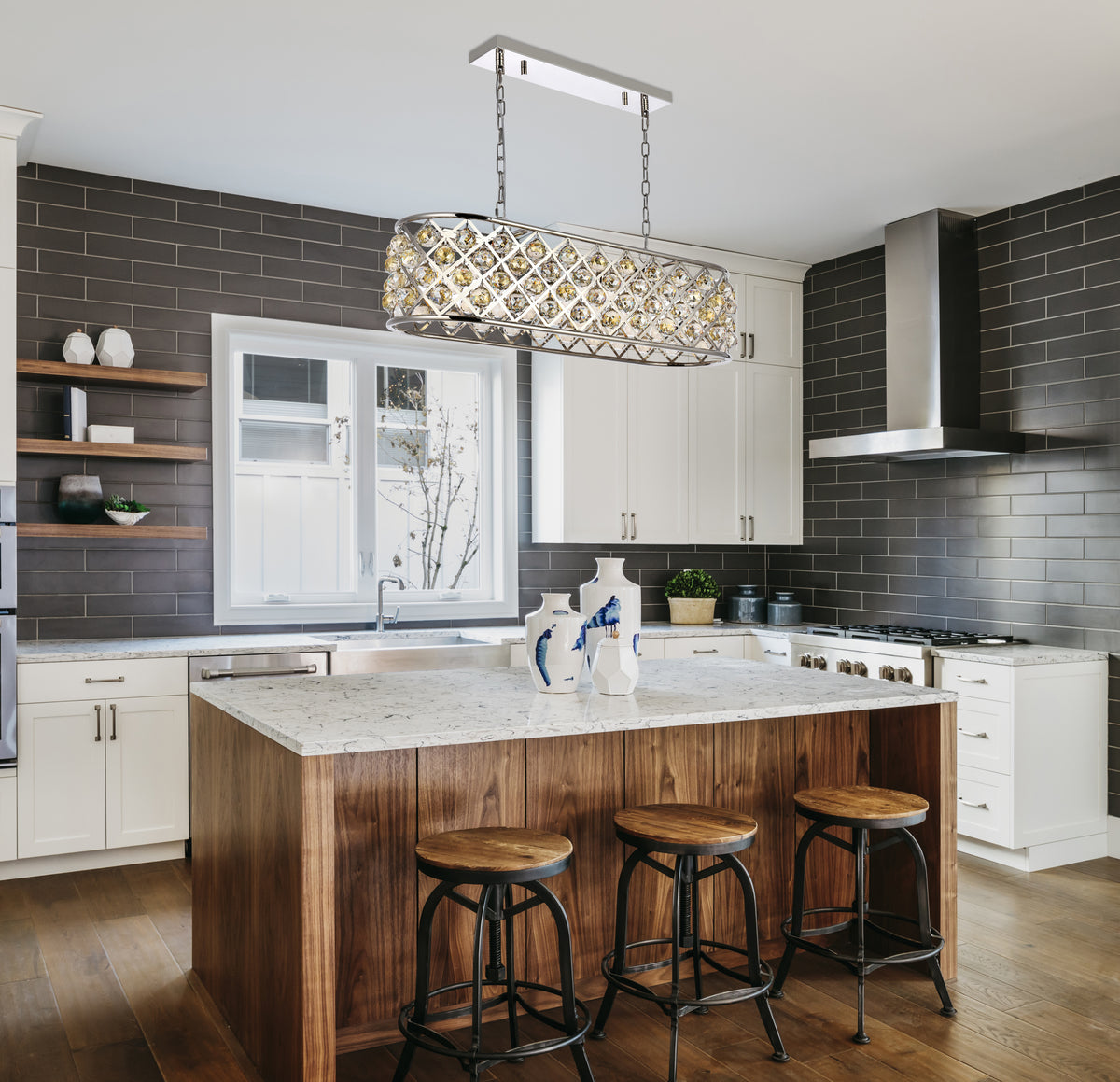Modern simplicity meets organic beauty in the breathtakingly unique Madison collection. Hand-polished, multifaceted clear, golden-teak, or Silver-shade crystal spheres shimmer like dewdrops in an oblong forged-iron grid with a golden-iron, mocha-brown, or polished-nickel finish. These airy chandeliers will brighten up a kitchen, dining room, foyer, or stairwell in an explosion of reflected light.