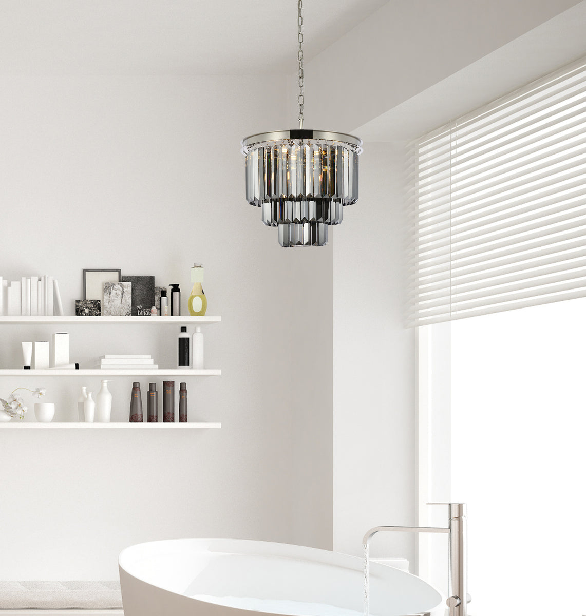Bring the splendor of the ballroom into your home with a sparkling Sydney fixture. Stunning in foyers, dining rooms, or stairwells, the Sydney collection brings to mind the glamour of the Roaring Twenties. Features glimmering tiers of royal-cut clear, golden-teak, or Silver-shade crystals. In mocha-brown or polished-nickel finishes, this sturdy, yet delicate, pendant lamp will be the perfect centerpiece for any décor.