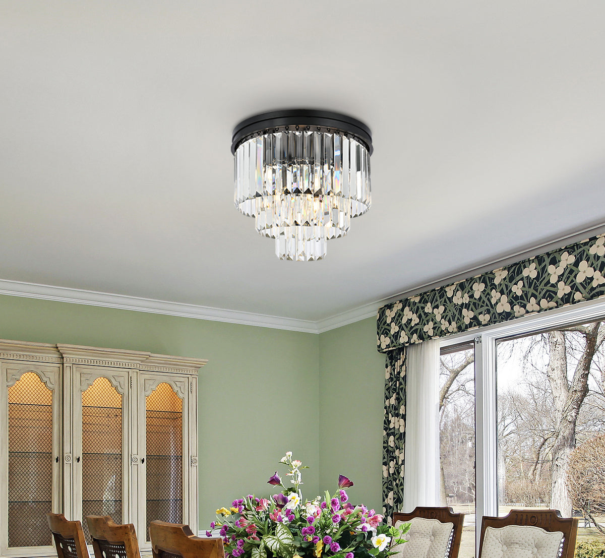 Timeless splendor and modern refinement are brought together in flush-mount Sydney fixtures. Dazzling in dining rooms, staircases, or hallways, the Sydney collection flaunts stunning tiers of royal-cut crystals in clear, golden teak, or Silver shade. A circular Matte Black or polished-nickel finished steel frame adds understated charm to this stunning flush-mount lamp.