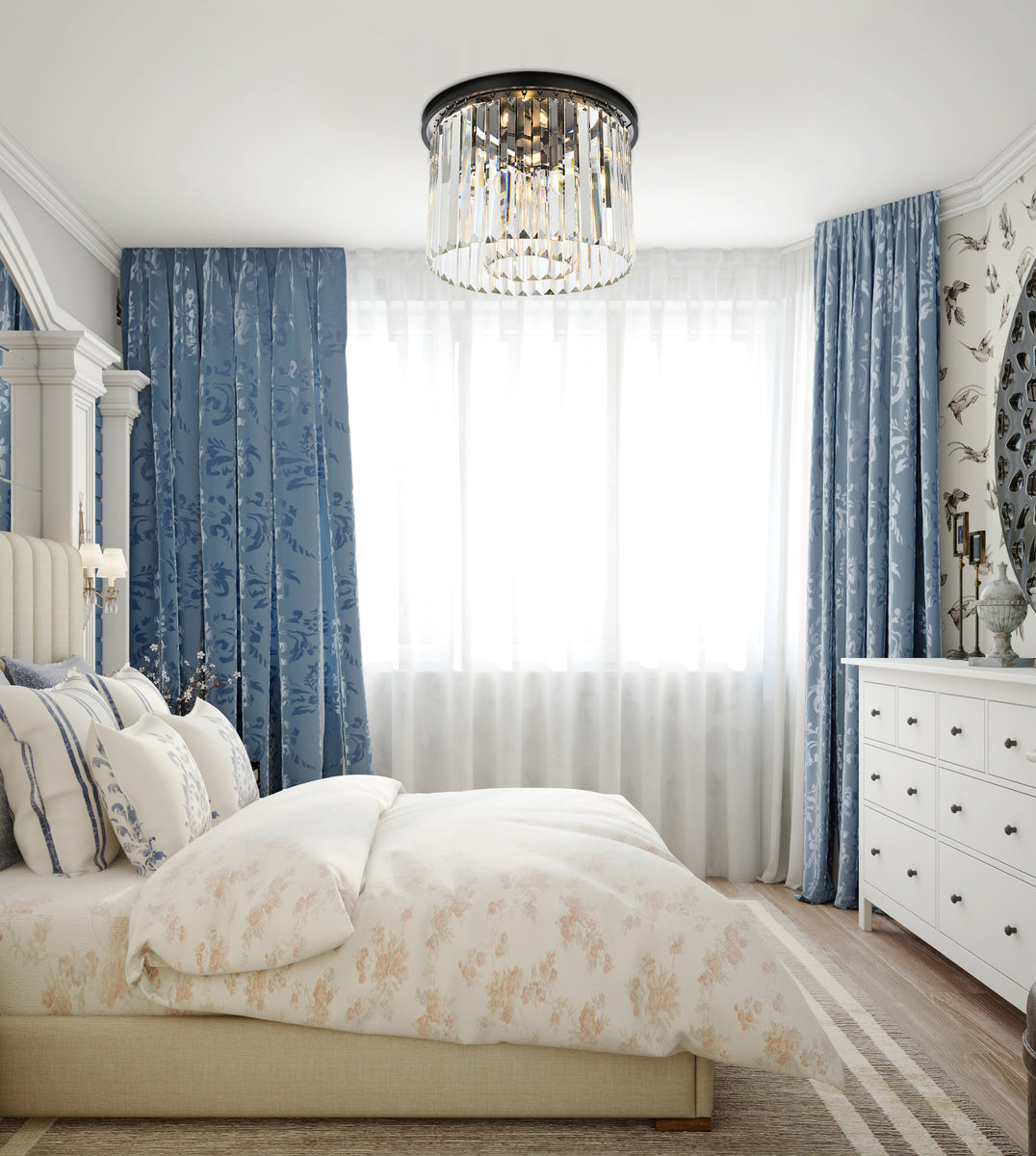 Timeless splendor and modern refinement are brought together in flush-mount Sydney fixtures. Dazzling in dining rooms, staircases, or hallways, the Sydney collection flaunts stunning tiers of royal-cut crystals in clear, golden teak, or Silver shade. A circular Matte Black or polished-nickel finished steel frame adds understated charm to this stunning flush-mount lamp.