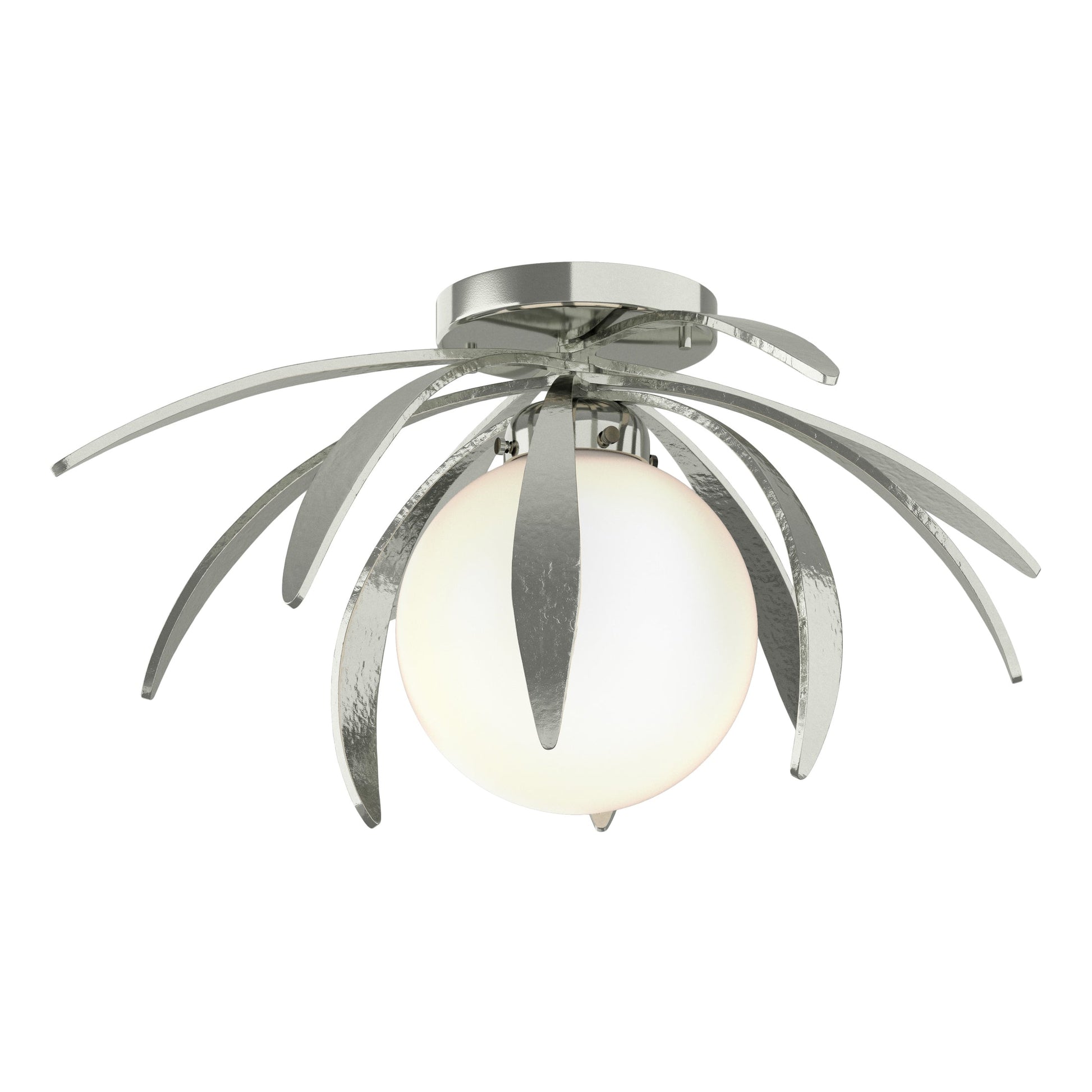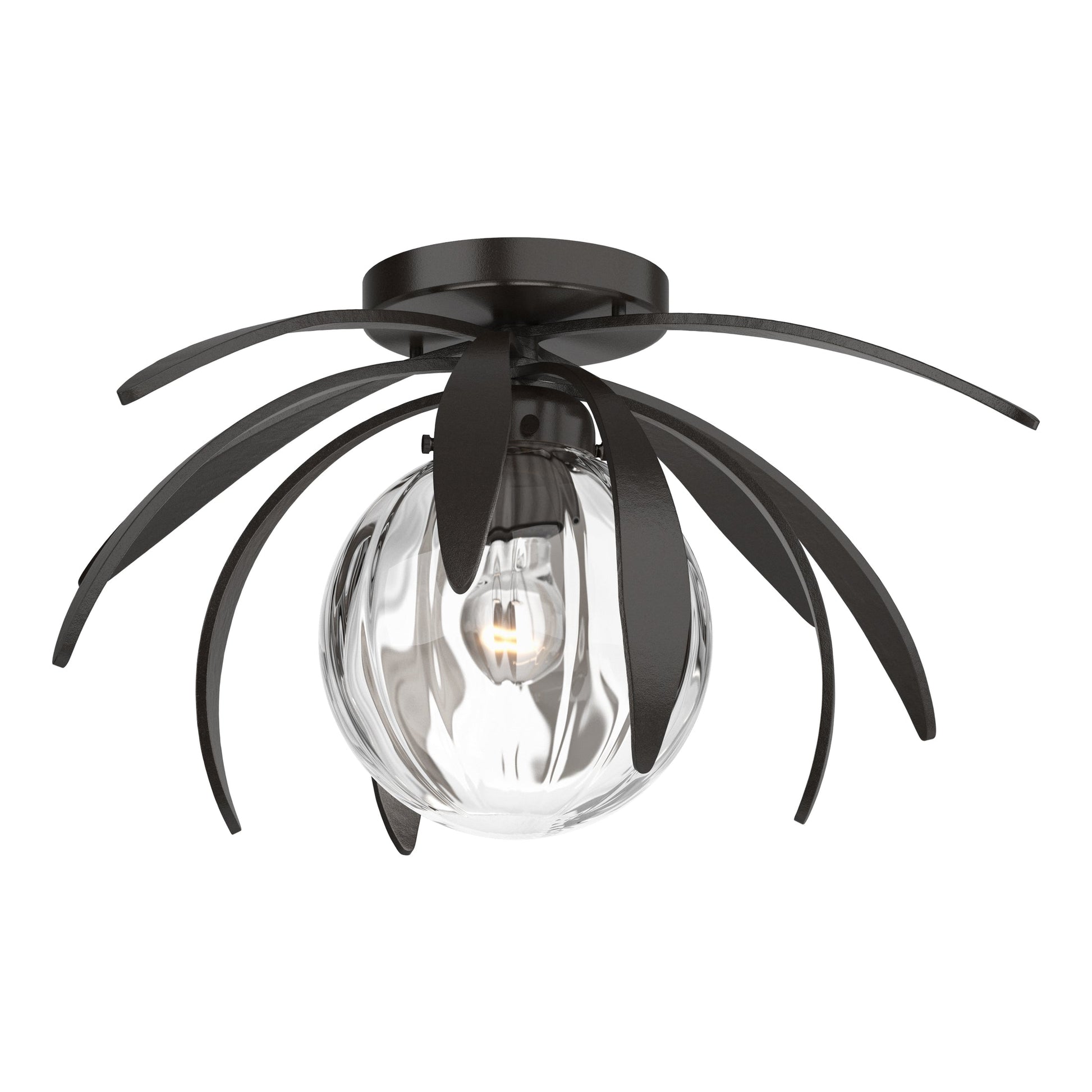 True to the beauty of its namesake flower, the Dahlia Flush Mount fixture provides a sculptural botanic aesthetic. Handcrafted forged steel “petals” flare outward and downward to embrace a glass globe containing a singular light source at its center. Available in 9 standard finishes. In addition to the flush mount, the Dahlia Collection includes chandeliers and mini pendant options to grace any space. Can also be wall mounted as a sconce.