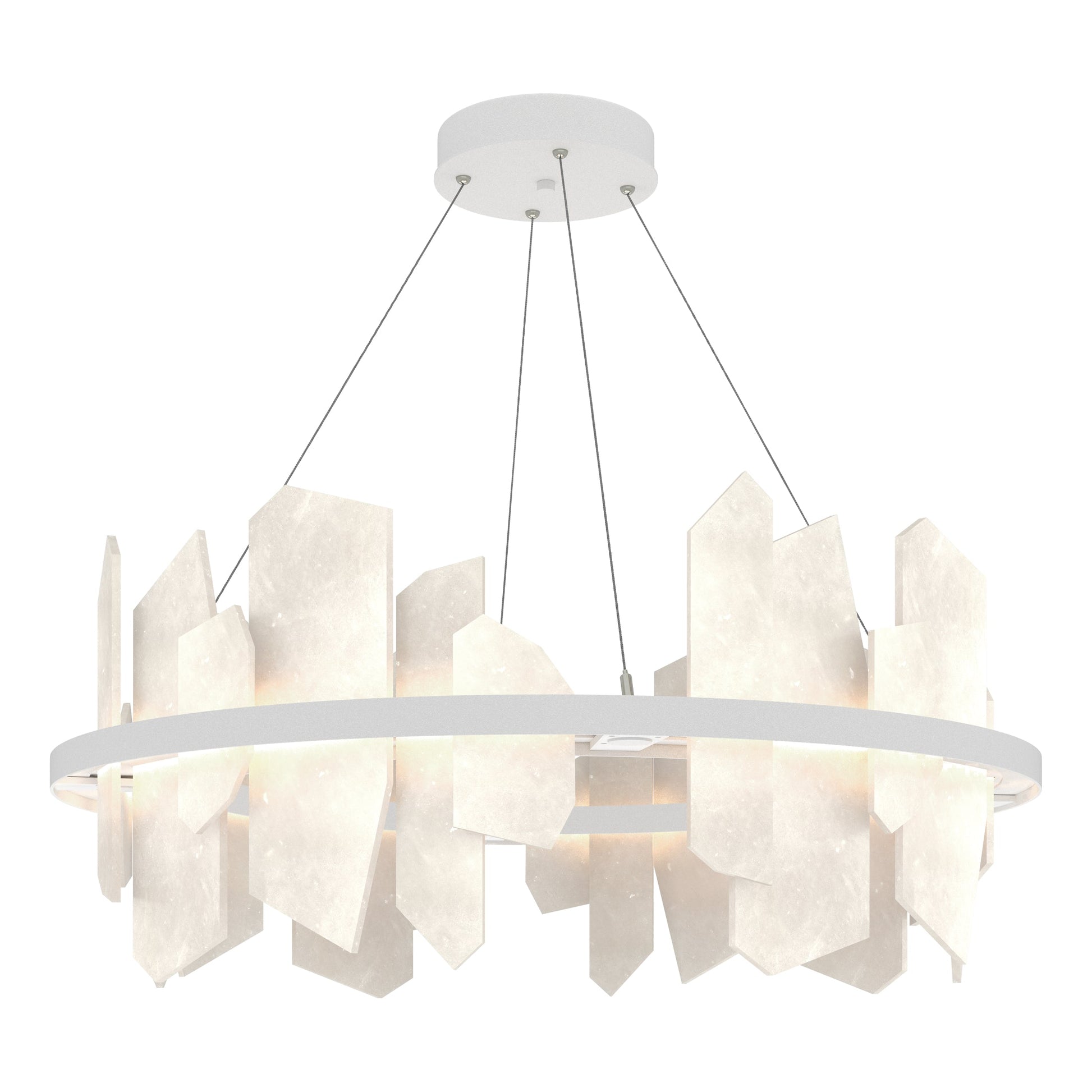 The Volterra Circular LED Pendant juxtaposes modern technology of LED light-guide with a soft stone used throughout history. As a sculptor, Designer Paul Marr Hilliard is attracted to natural materials. “Soft, subdued light with the translucent alabaster creates a warm glow. It’s a beautiful stone to work with.” We contrast that with an angular cut to the stone and have lit it each from both sides, creating a stunning wash of up and down light.