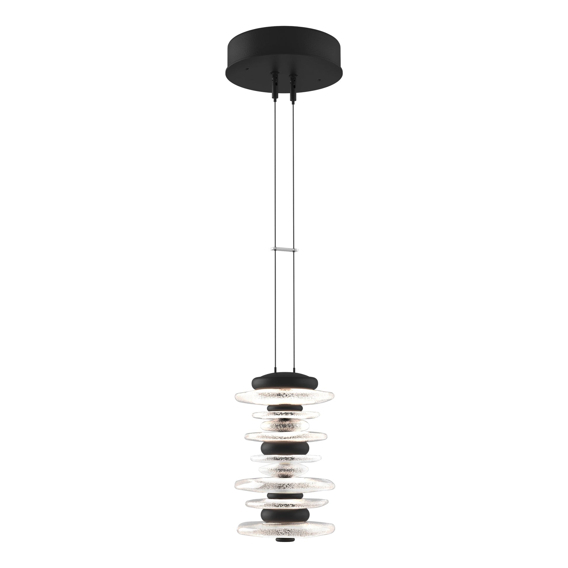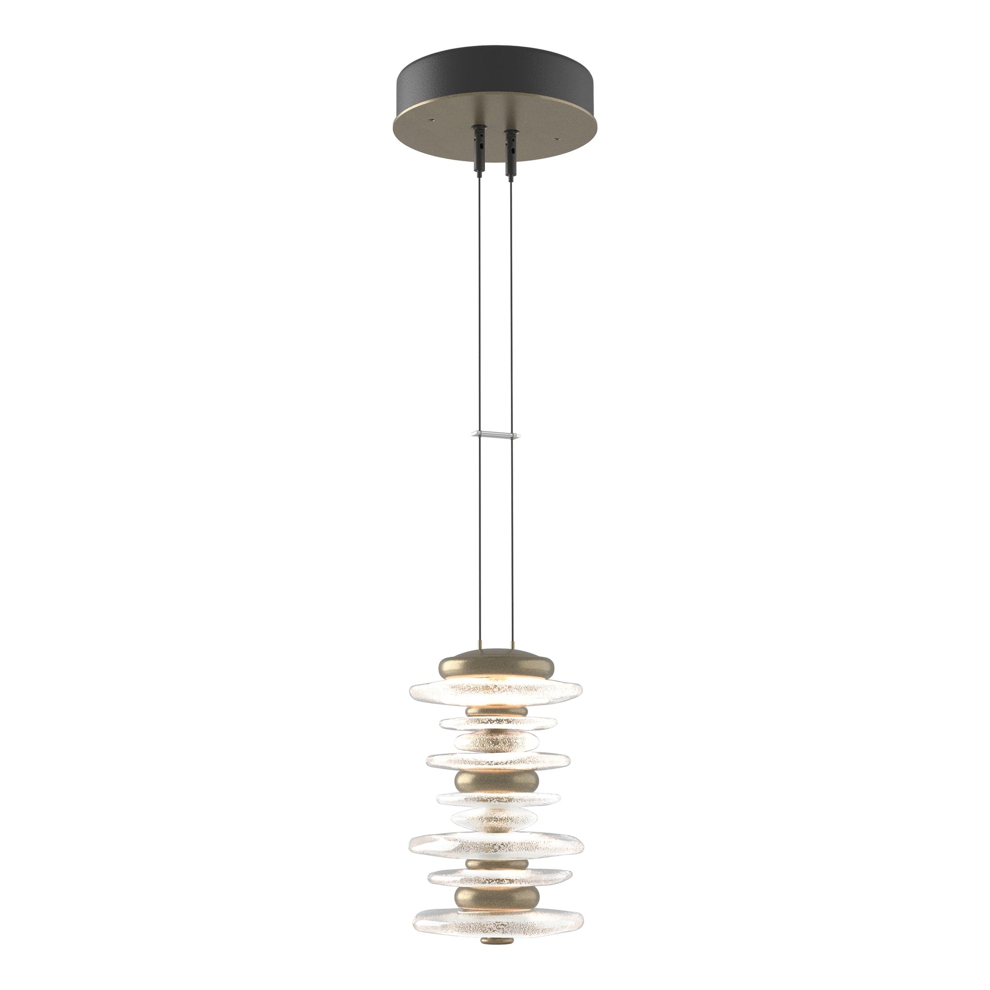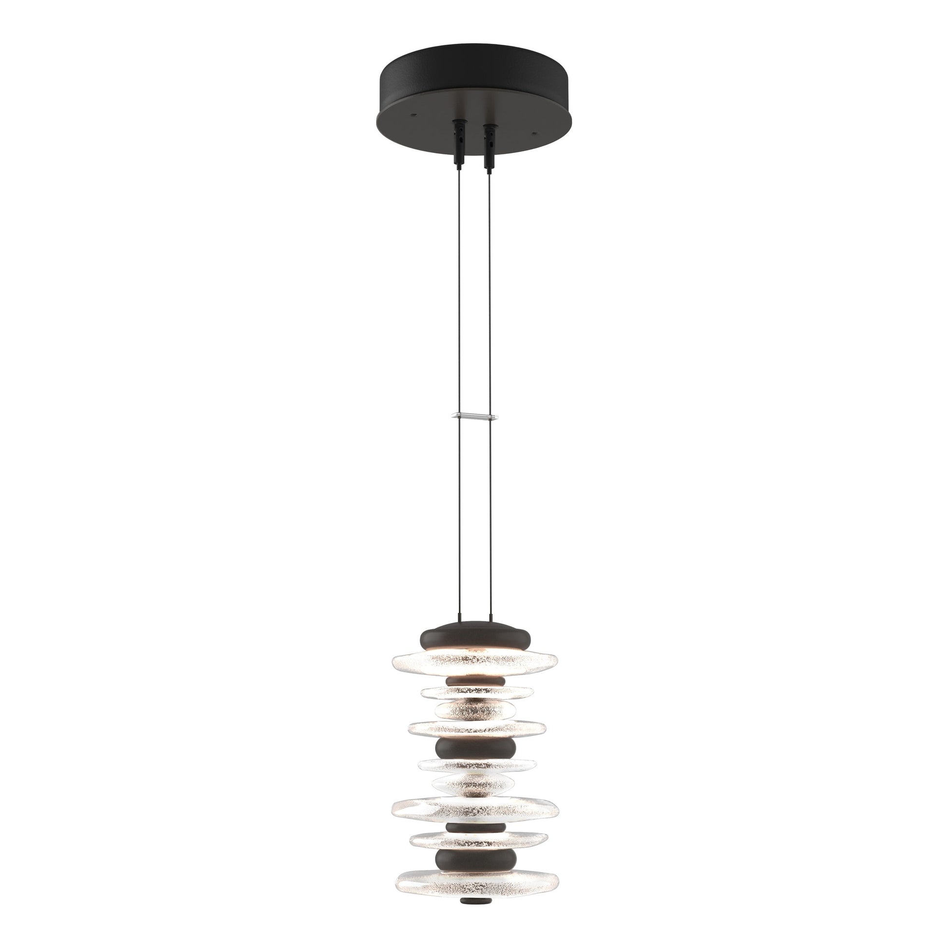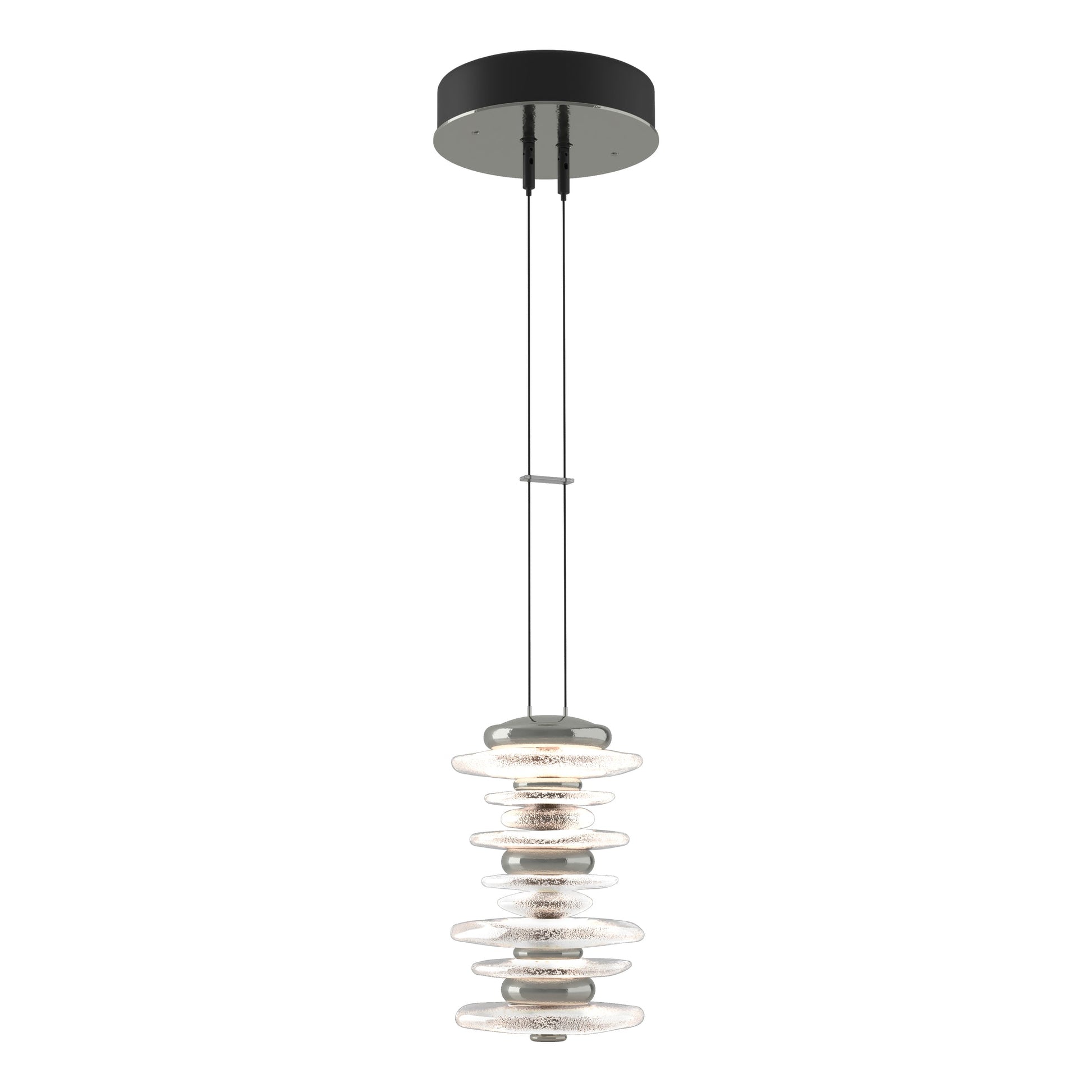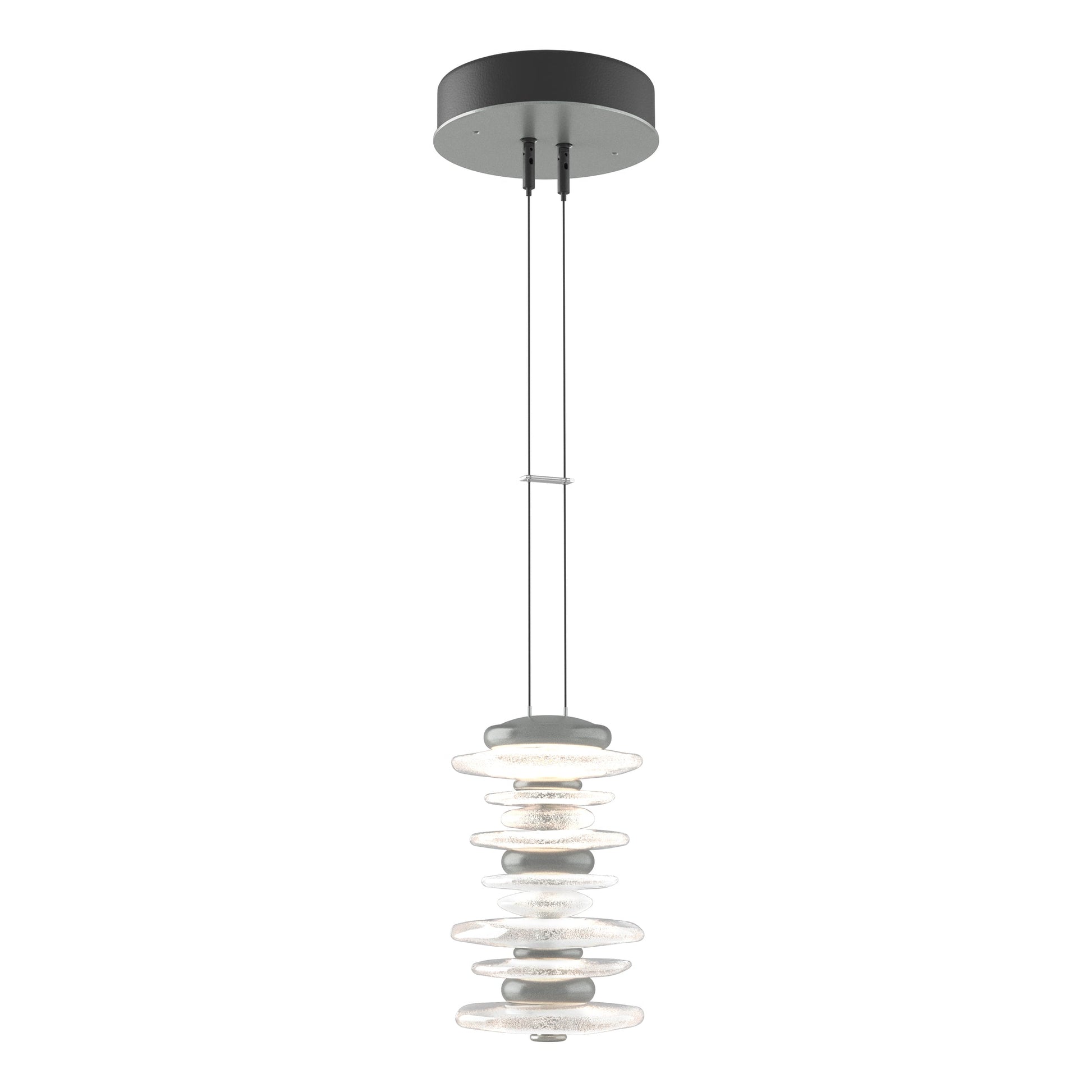 The Hubbardton Forge Cairn Pendant pays homage to the enigmatic stone sculptures, used since ancient times as landmarks. Thick hand-poured glass and cast steel “stones” are artistically stacked, and suspended by thin cables, creating a stunning illumination. Light flows over the steel and through the glass to seemingly glow from the inside. Also available as a smaller Mini Pendant.