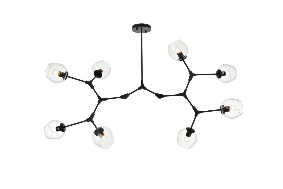 Introducing the Cavoli 74-Inch Chandelier, a perfect fusion of contemporary design and geometric allure. Crafted from durable iron, this visually captivating centerpiece not only adds a sleek modern aesthetic to your space but also ensures a robust and enduring lighting solution. The chandelier holds UL certification, guaranteeing safety and performance adherence. Boasting eight lights with clear glass globe shades, this chandelier offers a stunning visual display, complemented by a dimmable feature for personalized lighting preferences. (Bulbs not included). Illuminate your space with confidence and style.