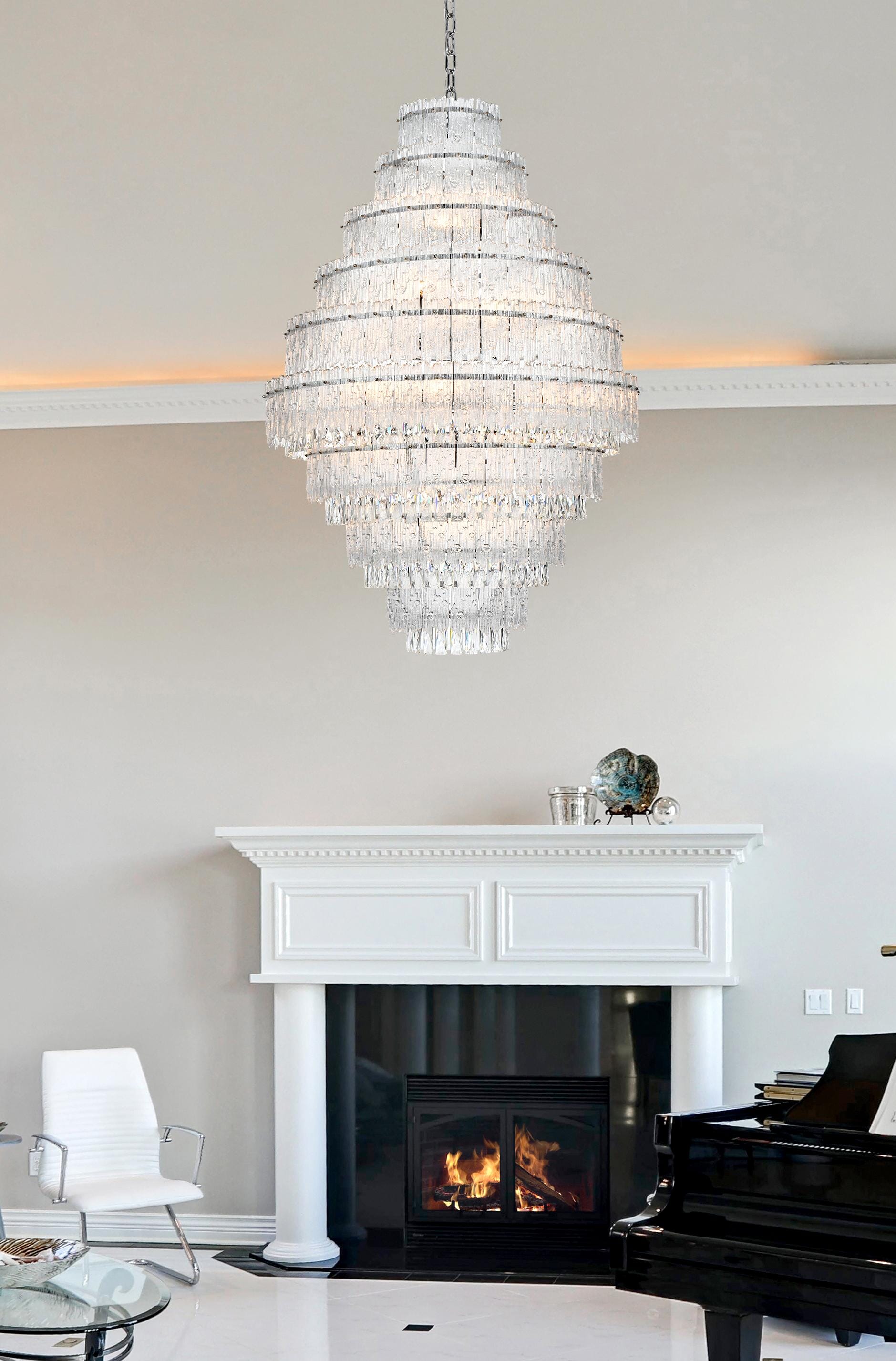 Transform your home with the opulent charm of this indoor lighting, meticulously designed to make a statement in any space. The light fixture showcases an intricate array of precision-cut clear crystals, each expertly faceted to maximize light refraction and create a dazzling display of brilliance. These crystals are complemented by textured glass accents that add depth and visual interest, casting a soft, shimmering glow across the room. Available in your choice of chrome or satin gold finishes, it is the epitome of luxury and modern elegance. As part of a coordinated collection, it also includes matching chandeliers, wall sconces and flush mounts, allowing you to create a harmonious lighting scheme throughout your home.