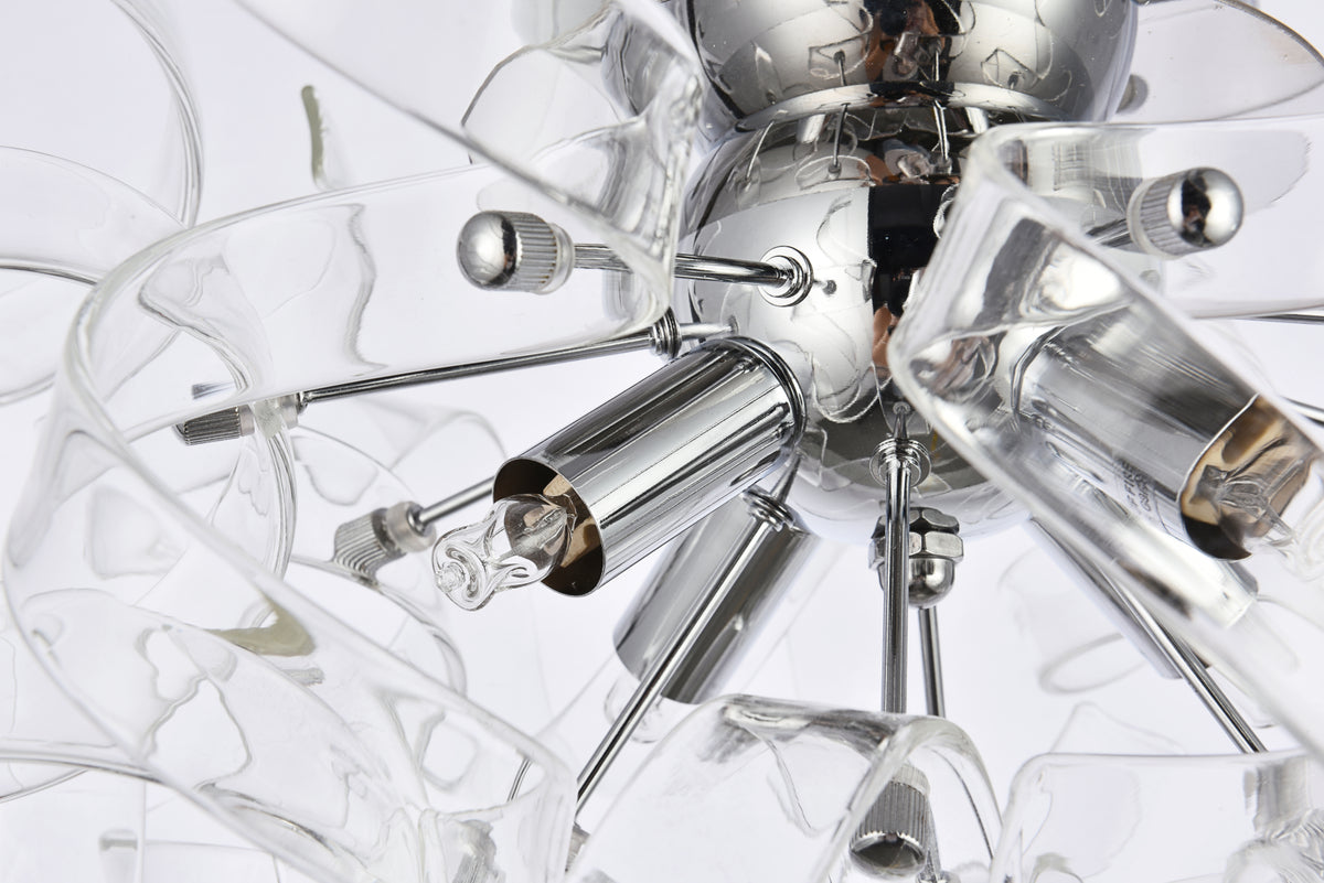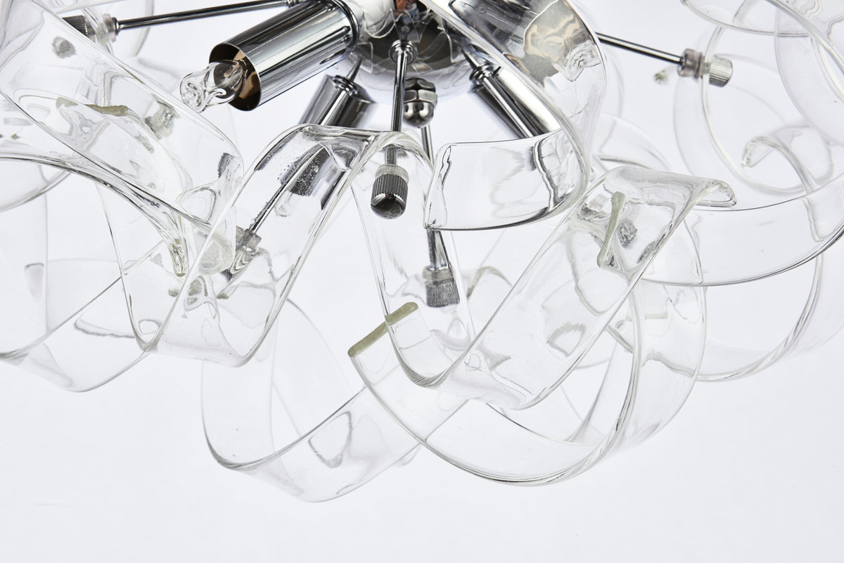 Intriguing Ritz flush-mount fixtures turn any space into a celebration. Like a decoration for a special present, the captivating hemisphere of delicate, curled ribbons of glass will create a relaxing ambience in any room. Four bright lights shine through this contemporary chrome-finished design. The Ritz collection is sure to delight in your dining room, living room, bedroom, bathroom, and entryway.