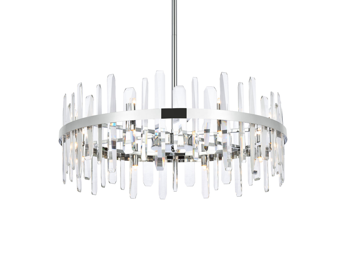 Modern crystal chandelier features top and bottom tier crystal prisms staggered along the wrought iron frame. The thick metal frame wraps around top grade crystal prisms ensure it is built to last, definitely worth it. Hang this work of art and dim the lights for a bit of sophisticated lighting in your home. Get lost in a beautiful light and sleek design available in multiple finishes. The hanging rod conveniently comes with a slope ceiling adapter, perfect for your vaulted or angled ceiling.