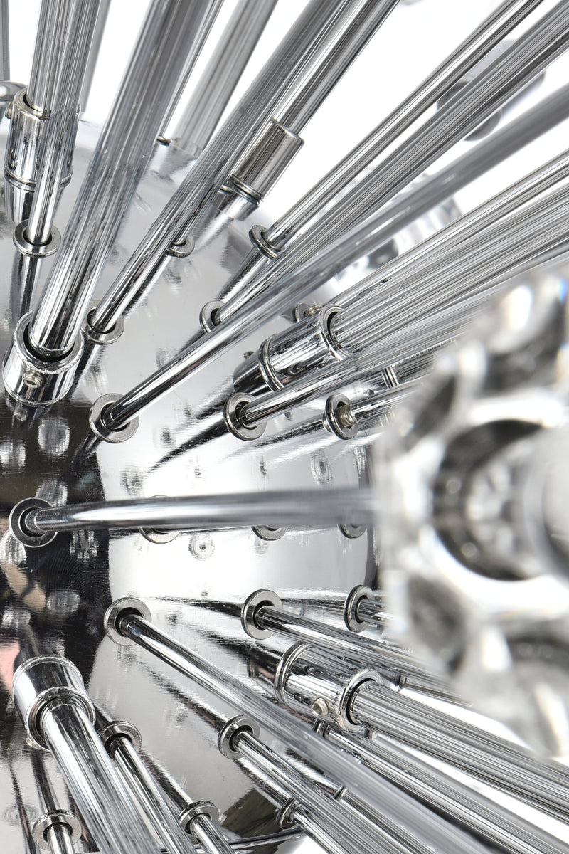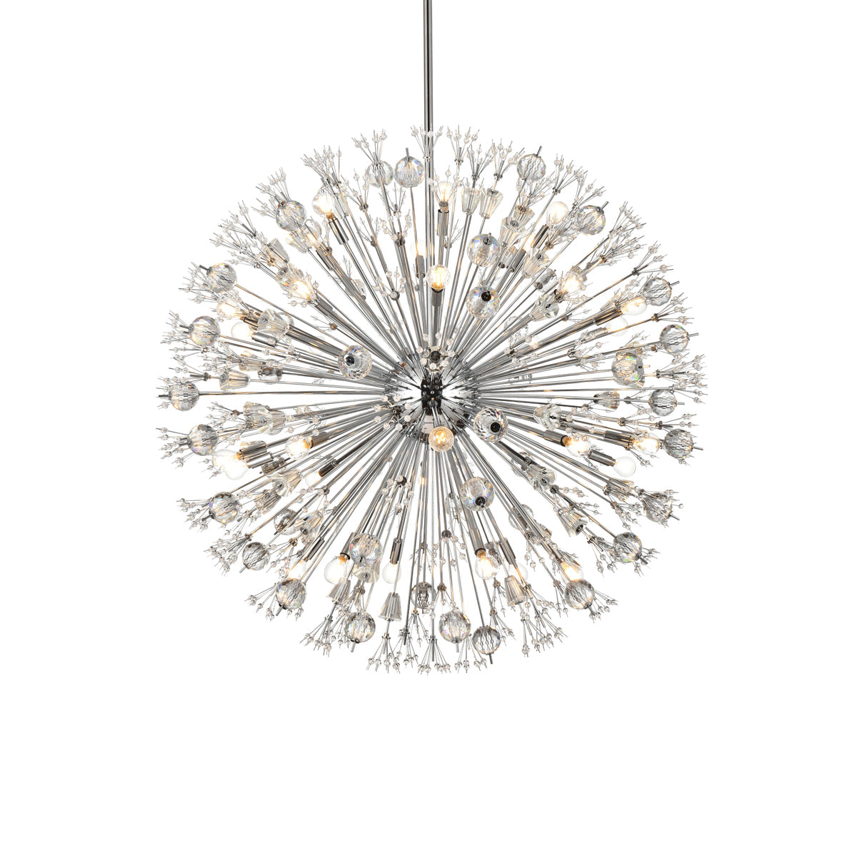 Like an explosion frozen in time, Vera collection hanging fixtures are suspended chaos. Clear large crystal balls and sprays of smaller crystals swirl amidst exposed candelabra bulbs (not included) balanced on dainty wires. A gleaming steel sphere forms the epicenter of the storm. A touch of savage beauty that easily compliments a kitchen, entryway, or bedroom. Sloped ceiling adaptable with a durable swivel could be mounted on vaulted or angled ceilings