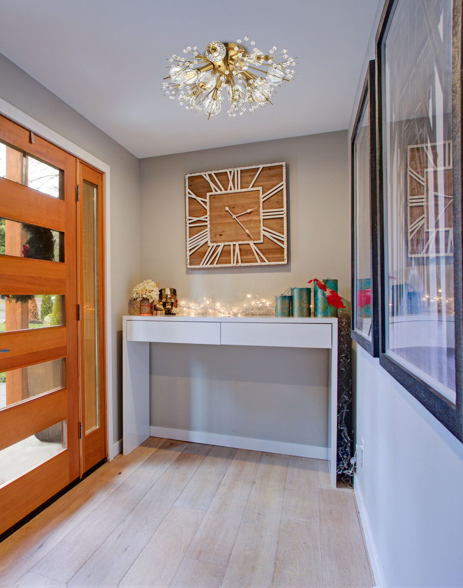 Like an explosion frozen in time, Vera collection are suspended chaos. Clear large crystal balls and sprays of smaller crystals swirl amidst exposed candelabra bulbs (not included). At the epicenter of the storm, a hemispherical steel backplate in a metal finish attaches to the wall or the ceiling. A touch of savage beauty that easily compliments a bathroom, entryway, or bedroom.
