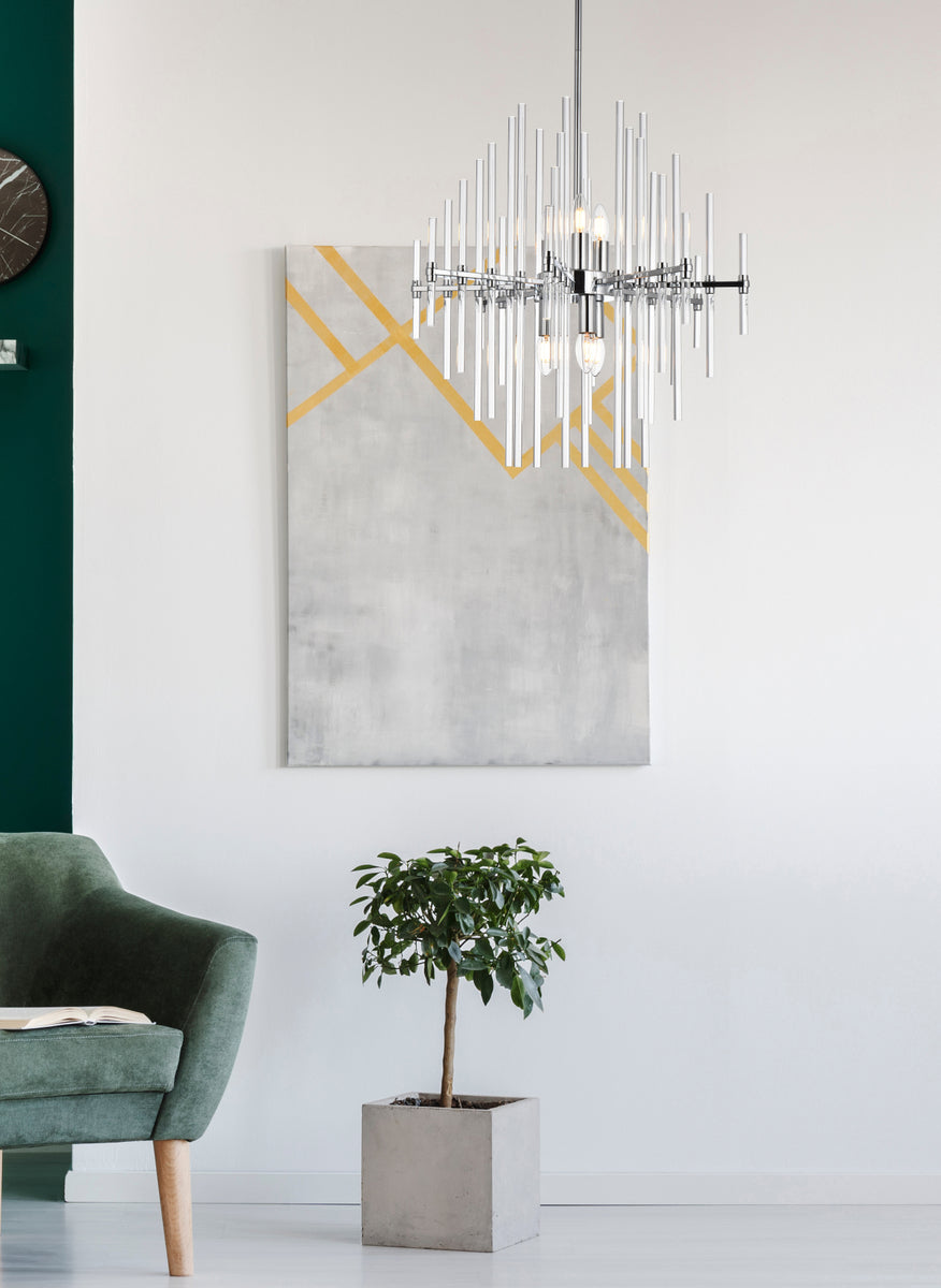 Enjoy the beautiful design of the Sienna collection pendants. The clear crystal rods seem as if they are following the direction of the lights bringing about illumination. Is it the sun? Is it a new day? No, it's simply just a fabulous light pendant! The perfect addition to your home, whether it's the living room, dining room, office or the entryway. Sloped ceiling adaptable with a durable swivel could be mounted on vaulted or angled ceilings.