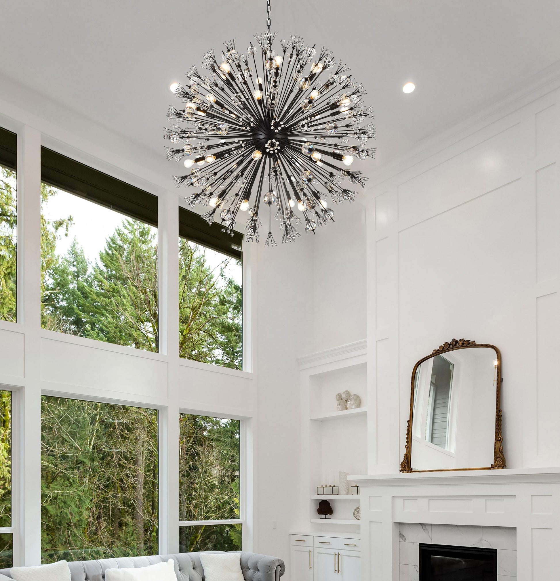 Like an explosion frozen in time, Vera collection hanging fixtures are suspended chaos. Clear large crystal balls and sprays of smaller crystals swirl amidst exposed candelabra bulbs (not included) balanced on dainty wires. A gleaming steel sphere forms the epicenter of the storm. A touch of savage beauty that easily compliments a kitchen, entryway, or bedroom. With easy assembly and compatibility with multiple bulbs, this chandelier not only illuminates but elevates your space with timeless sophistication.