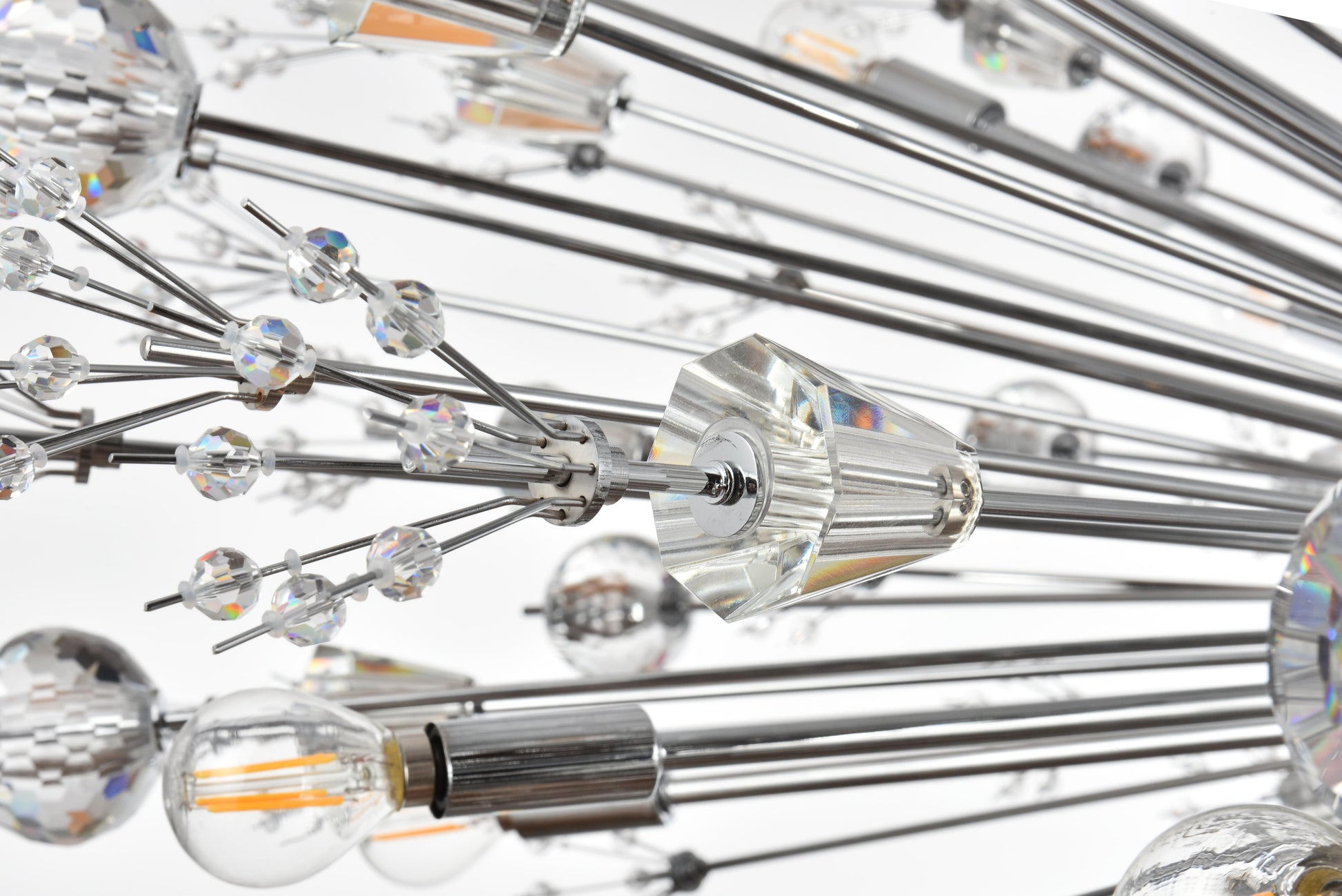 Like an explosion frozen in time, Vera collection hanging fixtures are suspended chaos. Clear large crystal balls and sprays of smaller crystals swirl amidst exposed candelabra bulbs (not included) balanced on dainty wires. A gleaming steel sphere forms the epicenter of the storm. A touch of savage beauty that easily compliments a kitchen, entryway, or bedroom. With easy assembly and compatibility with multiple bulbs, this chandelier not only illuminates but elevates your space with timeless sophistication.