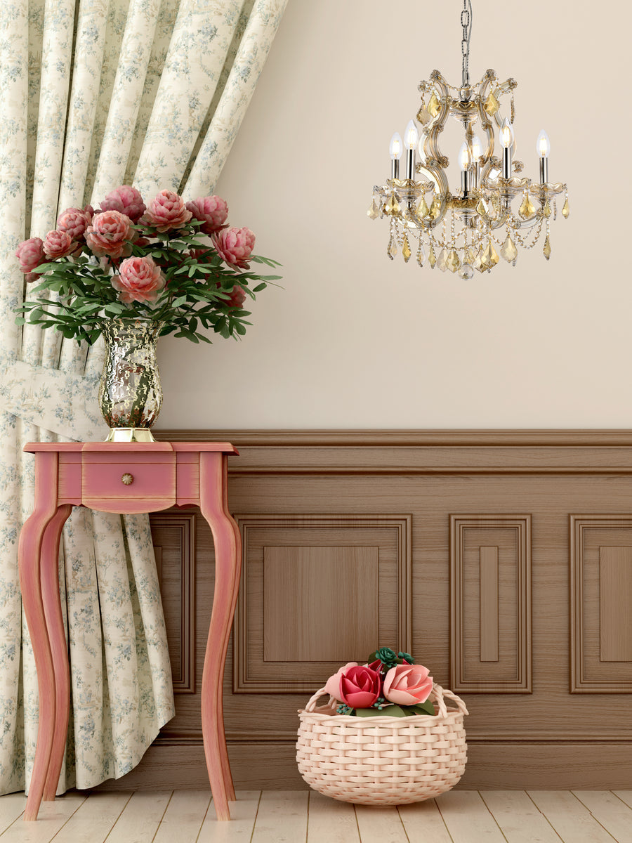 A heavenly high point to your home, Maria Theresa collection pendant lamps are ablaze with hundreds of resplendent crystals. Copious strands of sparkling clear or golden-teak crystals dangle from elaborate tiers of glass-coated steel arms in your choice of a chrome, gold, golden-teak, white, or black finish. An imperial favorite for the stairwell, dining room, or living room.