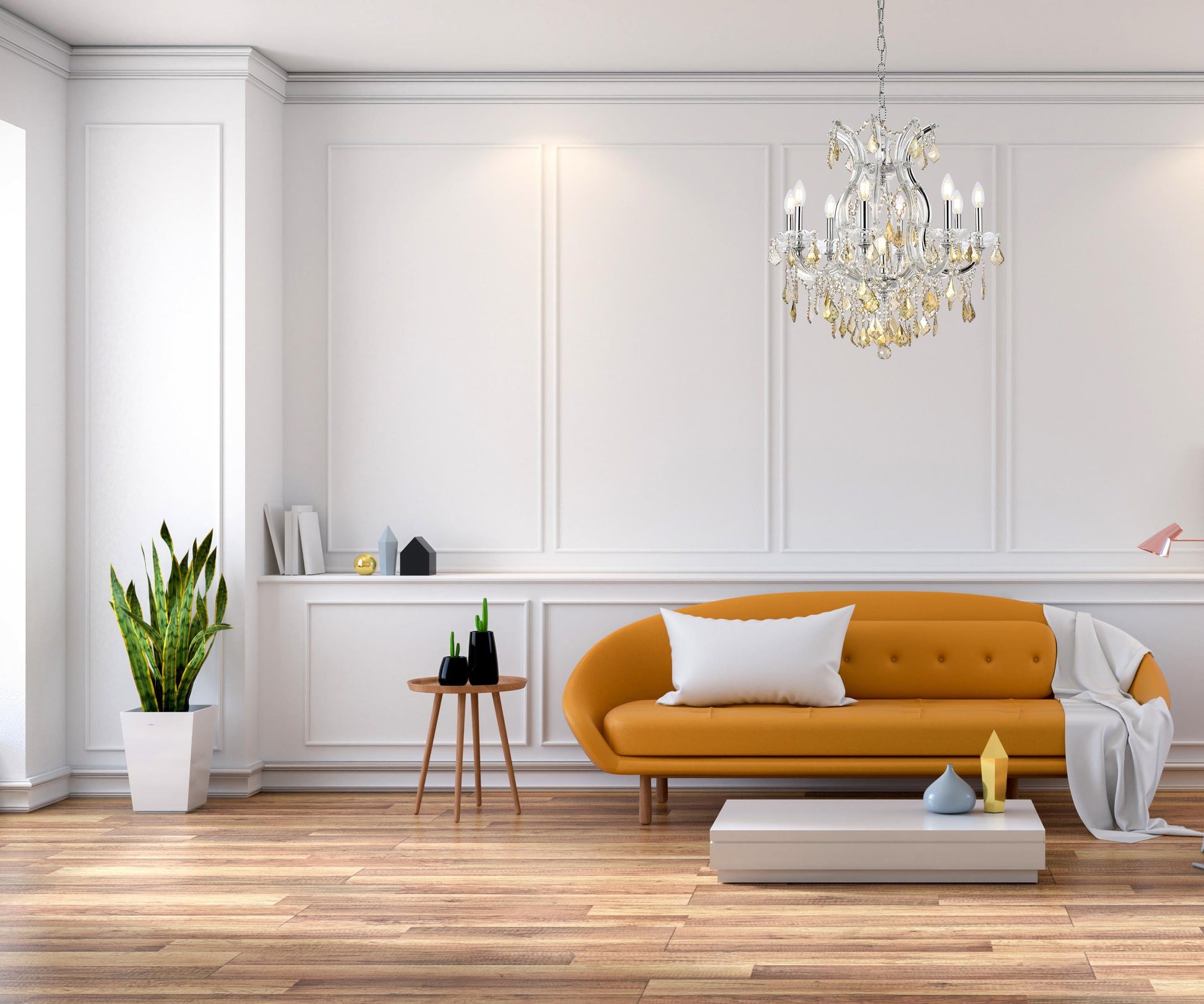 A heavenly high point to your home, Maria Theresa collection pendant lamps are ablaze with hundreds of resplendent crystals. Copious strands of sparkling clear or golden-teak crystals dangle from elaborate tiers of glass-coated steel arms in your choice of a chrome, gold, golden-teak, white, or black finish. An imperial favorite for the stairwell, dining room, or living room.