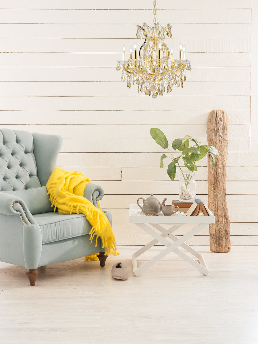 A heavenly high point to your home, Maria Theresa collection pendant lamps are ablaze with hundreds of resplendent crystals. Copious strands of sparkling clear or golden-teak crystals dangle from elaborate tiers of glass-coated steel arms in your choice of a chrome, gold, golden-teak, white, or black finish. An imperial favorite for the stairwell, dining room, or living room.