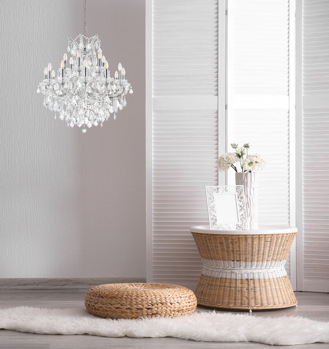 A heavenly high point to your home, Maria Theresa collection pendant lamps are ablaze with hundreds of resplendent crystals. Copious strands of sparkling clear or golden-teak crystals dangle from elaborate tiers of glass-coated steel arms in your choice of a chrome, gold, golden-teak, white, or black finish. An imperial favorite for the stairwell, dining room, or living room.