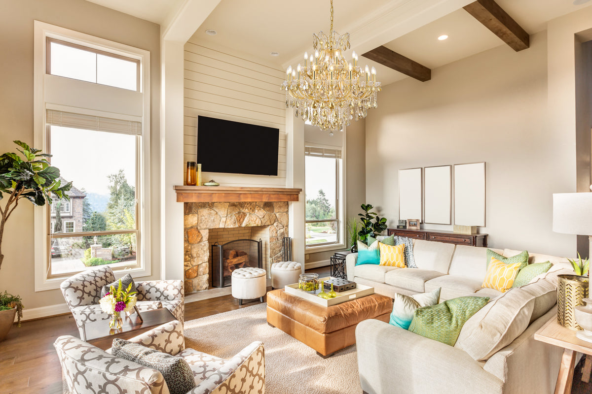 A heavenly high point to your home, Maria Theresa collection pendant lamps are ablaze with hundreds of resplendent crystals. Copious strands of sparkling clear or golden-teak crystals dangle from elaborate tiers of glass-coated steel arms in your choice of a chrome, gold, golden-teak, white, or black finish. An imperial favorite for the stairwell, dining room, or living room.