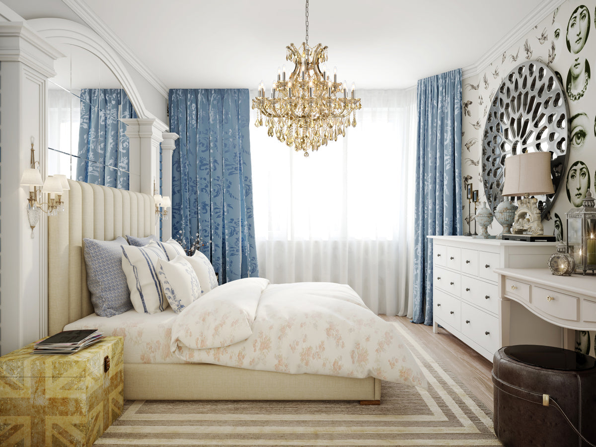 A heavenly high point to your home, Maria Theresa collection pendant lamps are ablaze with hundreds of resplendent crystals. Copious strands of sparkling clear or golden-teak crystals dangle from elaborate tiers of glass-coated steel arms in your choice of a chrome, gold, golden-teak, white, or black finish. An imperial favorite for the stairwell, dining room, or living room.
