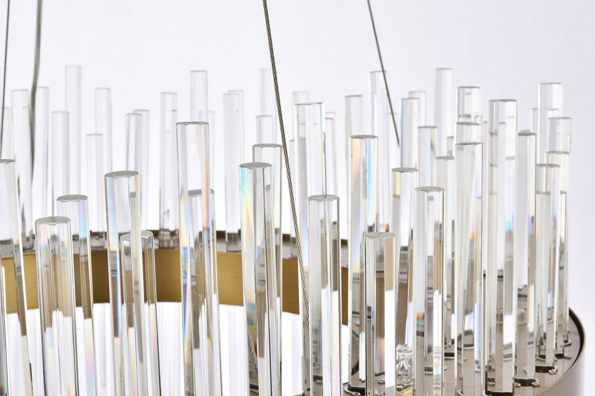 This stately fixture combines timeless elegance with modern and attractive sophistication. The delicate juxtaposition of upright and hanging clear glass rods creates a truly stunning visual statement, seamlessly woven together within a sleek gold frame. This expressive piece would be a welcomed and treasured addition to a wide range of contemporary residential styles.