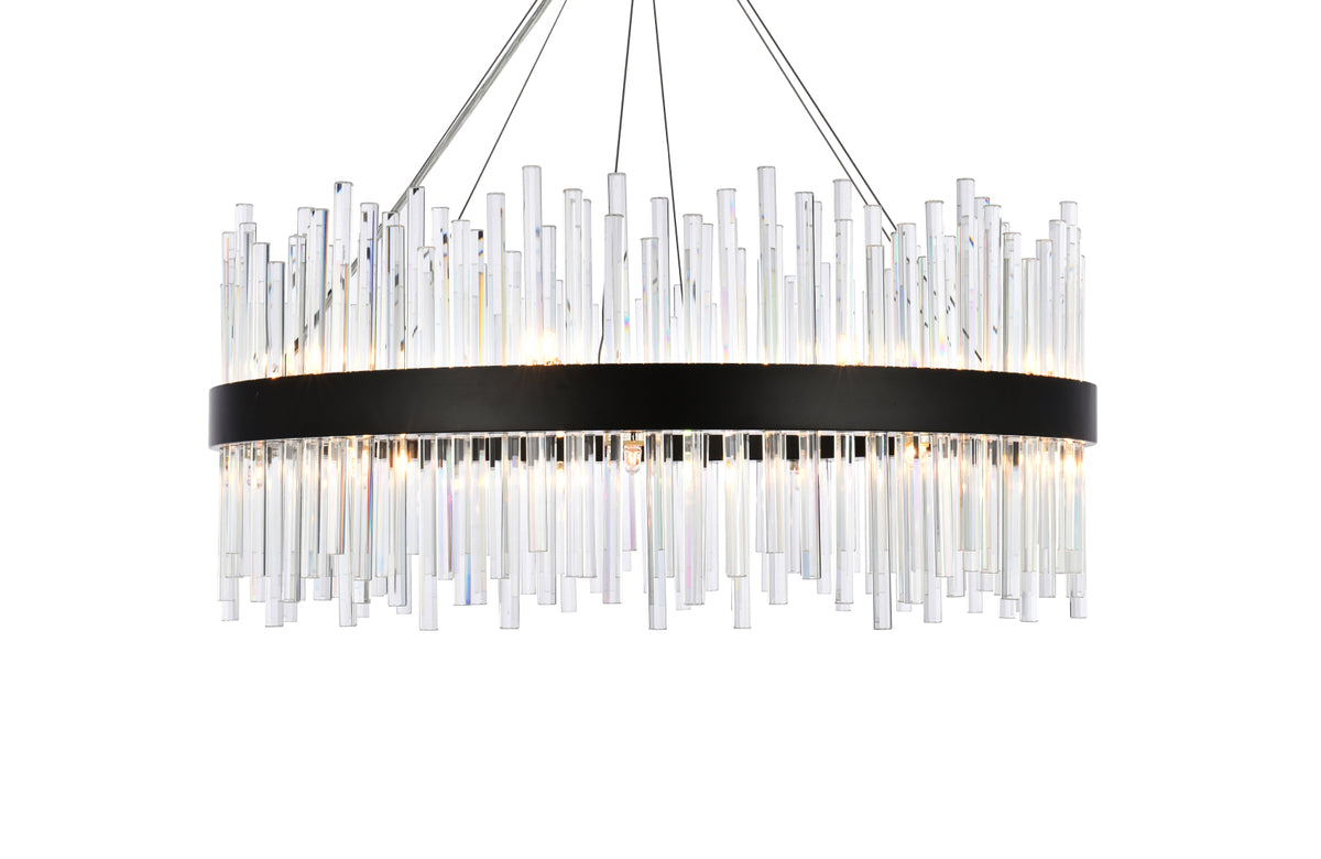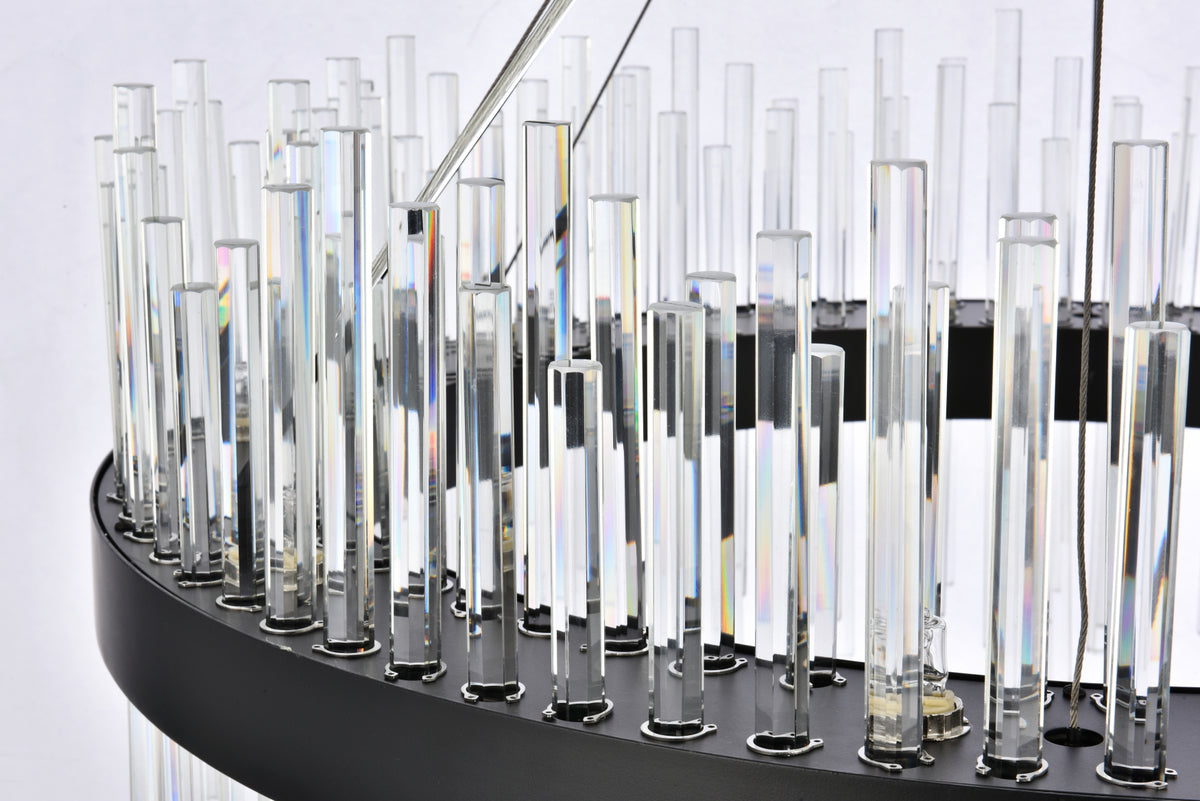 This stately fixture combines timeless elegance with modern and attractive sophistication. The delicate juxtaposition of upright and hanging clear glass rods creates a truly stunning visual statement, seamlessly woven together within a sleek bold metal frame. This expressive piece would be a welcomed and treasured addition to a wide range of modern residential styles.