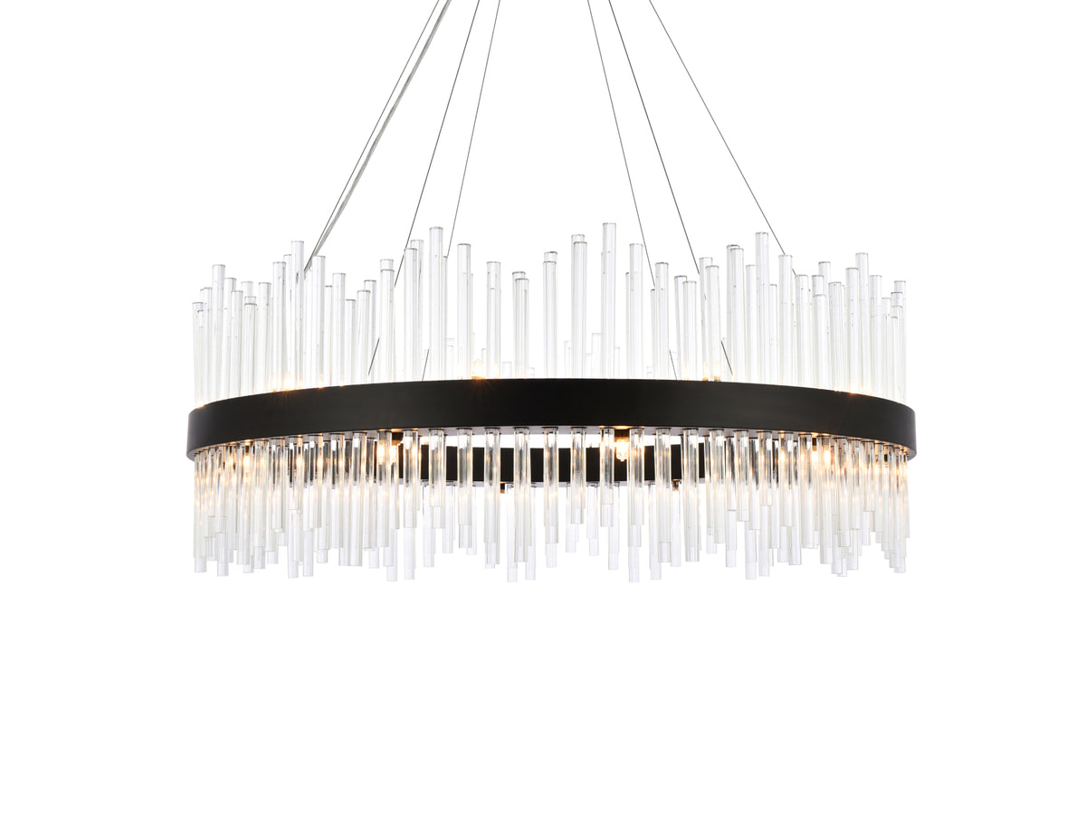 This stately fixture combines timeless elegance with modern and attractive sophistication. The delicate juxtaposition of upright and hanging clear glass rods creates a truly stunning visual statement, seamlessly woven together within a sleek bold metal frame. This expressive piece would be a welcomed and treasured addition to a wide range of modern residential styles.