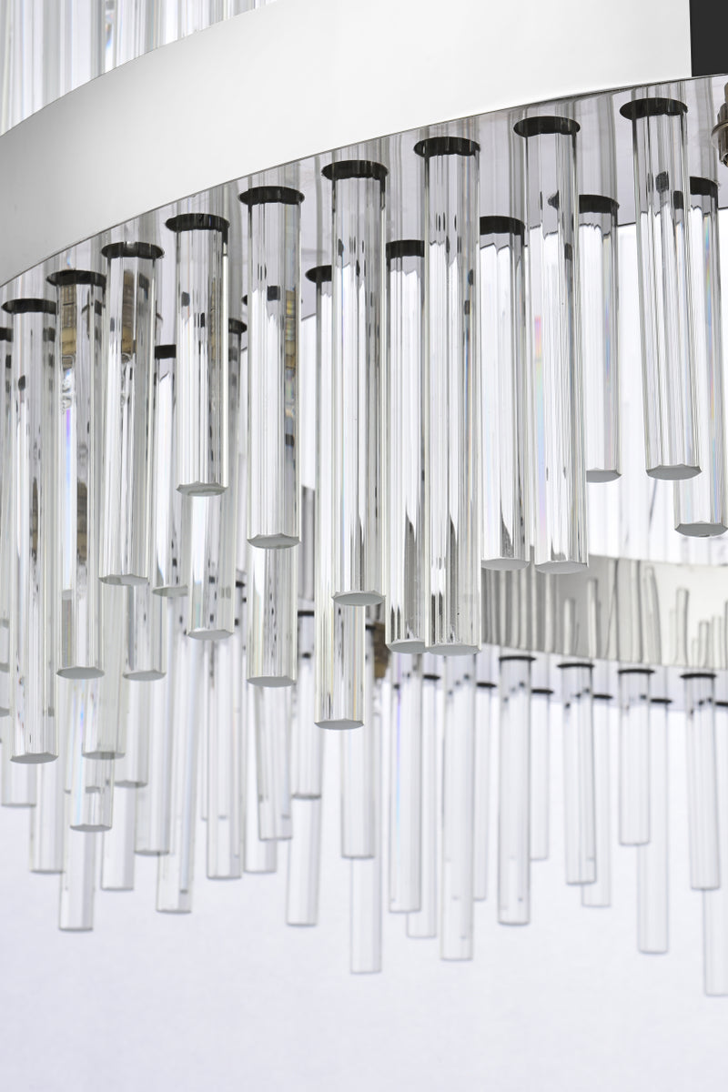 This stately fixture combines timeless elegance with modern and attractive sophistication. The delicate juxtaposition of upright and hanging clear glass rods creates a truly stunning visual statement, seamlessly woven together within a sleek bold metal frame. This expressive piece would be a welcomed and treasured addition to a wide range of modern residential styles.