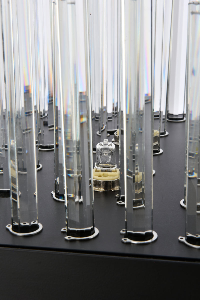 This stately fixture combines timeless elegance with modern and attractive sophistication. The delicate juxtaposition of upright and hanging clear glass rods creates a truly stunning visual statement, seamlessly woven together within a sleek bold metal frame. This expressive piece would be a welcomed and treasured addition to a wide range of modern residential styles.