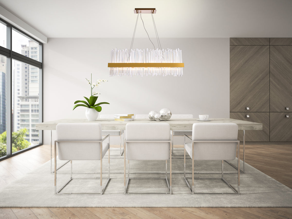 This stately fixture combines timeless elegance with modern and attractive sophistication. The delicate juxtaposition of upright and hanging clear glass rods creates a truly stunning visual statement, seamlessly woven together within a sleek gold frame. This expressive piece would be a welcomed and treasured addition to a wide range of contemporary residential styles.
