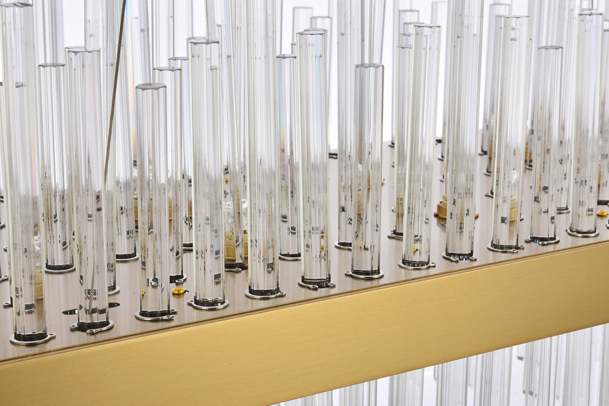 This stately fixture combines timeless elegance with modern and attractive sophistication. The delicate juxtaposition of upright and hanging clear glass rods creates a truly stunning visual statement, seamlessly woven together within a sleek bold metal frame. This expressive piece would be a welcomed and treasured addition to a wide range of modern residential styles.