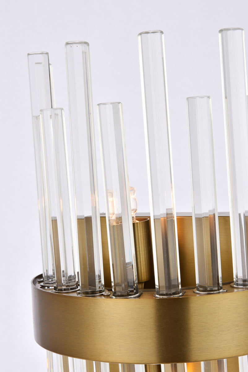 This stately fixture combines timeless elegance with modern and attractive sophistication. The delicate juxtaposition of upright and hanging clear glass rods creates a truly stunning visual statement, seamlessly woven together within a sleek gold frame. This expressive piece would be a welcomed and treasured addition to a wide range of contemporary residential styles.