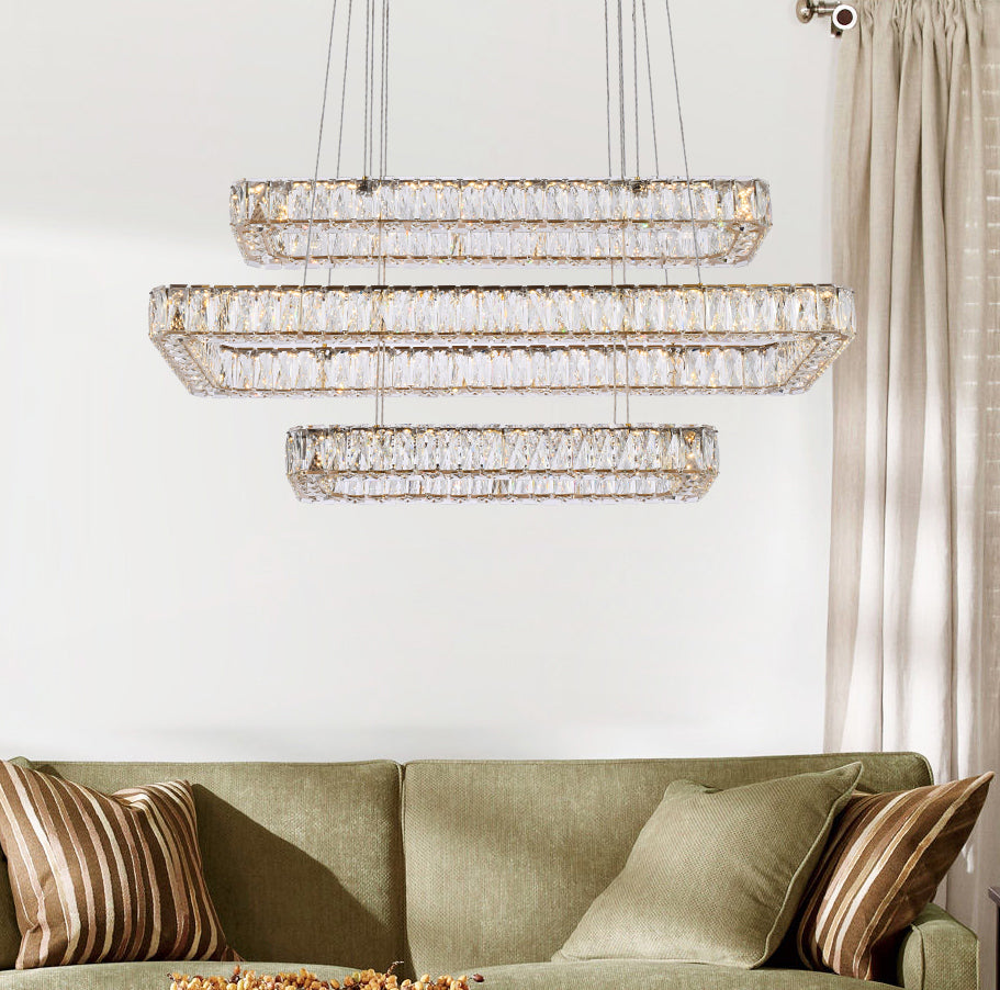 Diamonds are a girl’s best friend, and sparkling Monroe collection hanging fixtures take Marilyn’s famous lines to heart … for women and men alike. A minimal stainless-steel frame becomes dazzling when it is covered entirely with rectangular and square spectacularly faceted clear crystals. The oblong design hangs from almost invisible wires with brilliant integrated LED shining unseen from within. Stunning when placed in a dining room, kitchen, living room, or bedroom.