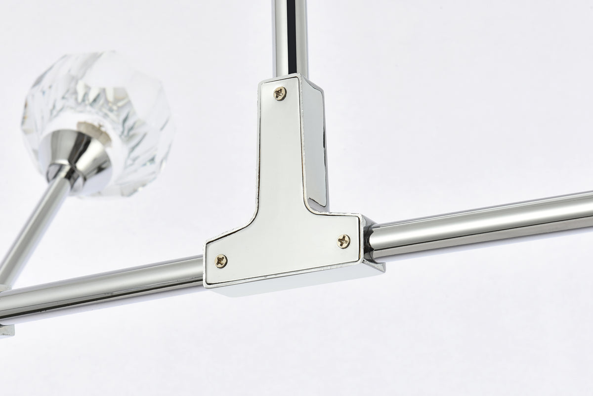 Crafted from iron metal and crystal, it features a round ceiling canopy, a hanging rod of 46 inch long, and arms extended with a solid K9 crystal ball from rods at all angles for a modern and linear look. Each 20W G9 bulb ( not included) is diffused by a faceted clear crystal ball giving the fixture a touch of industrial and glam inspiration. This work of art will add an artful focal point to your entryway, dining room, kitchen, or office. Evoking a sophisticated and timeless aesthetic to any space and will be an instant conversation started with its finely faceted crystal sphere which is polished by hand to reflect and refract light. Available in three different finishes in gold, chrome, and black.
