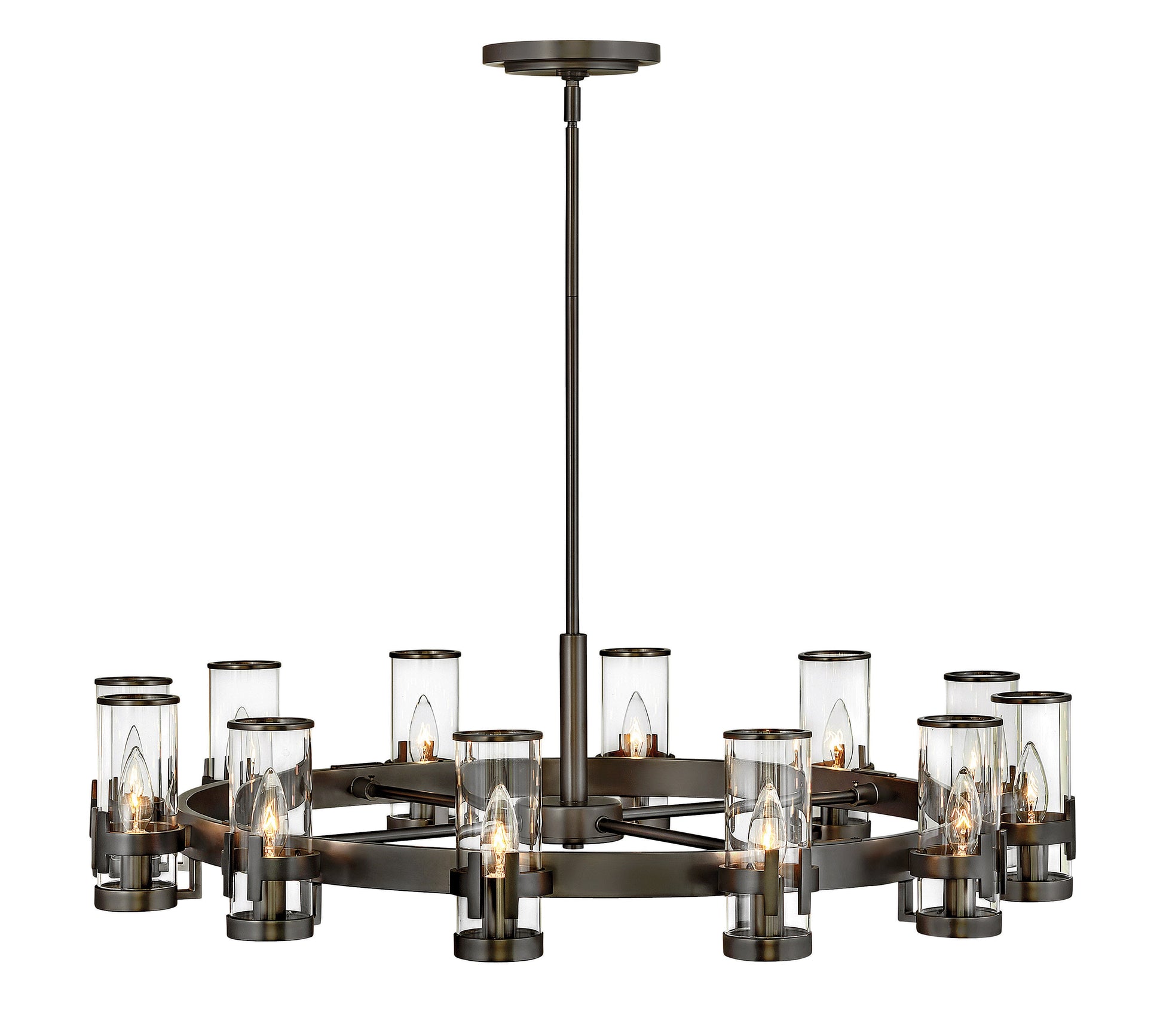 The Reeve chandelier balances sophistication with simplicity. The traditional low-profile silhouette is elevated by a wealth of elegant clear glass cylinders. Each glass is secured with a cast double-T bracelet matching the frame's luxurious finish with a corresponding metal band at the top.