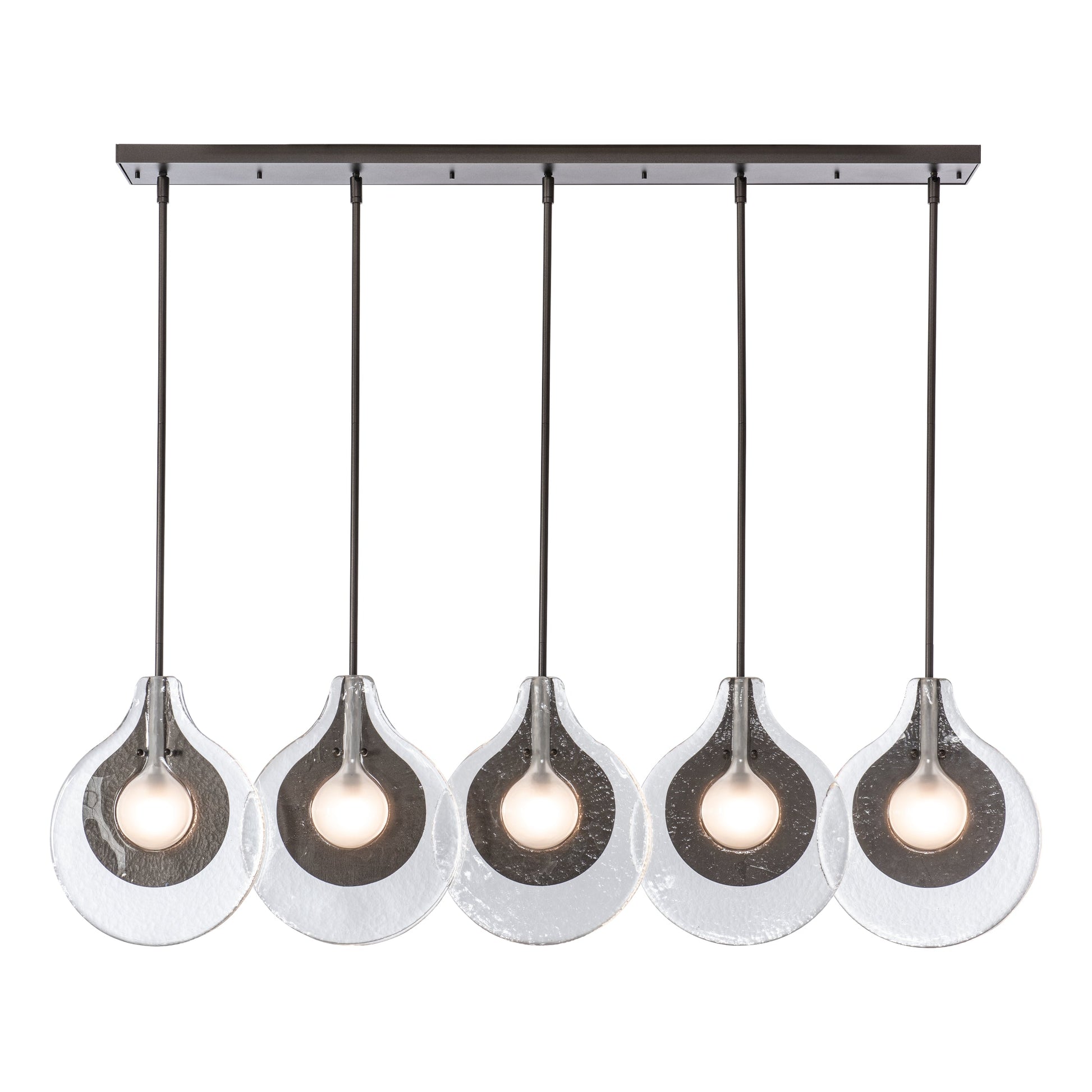 "Stunning." "Surprising." "Exquisite." We hear the new Veneto Collection described with excitement for its beautifully handcrafted Venetian glass. Look closely. The textured glass encases both the metal+bulb elements, with a central frosted glass in the bulb area. Part of the ART + ALCHEMY by Hubbardton Forge Collection, this linear Veneto pendant, by HF designer Jason Hancock, features five lights to dramatic effect.