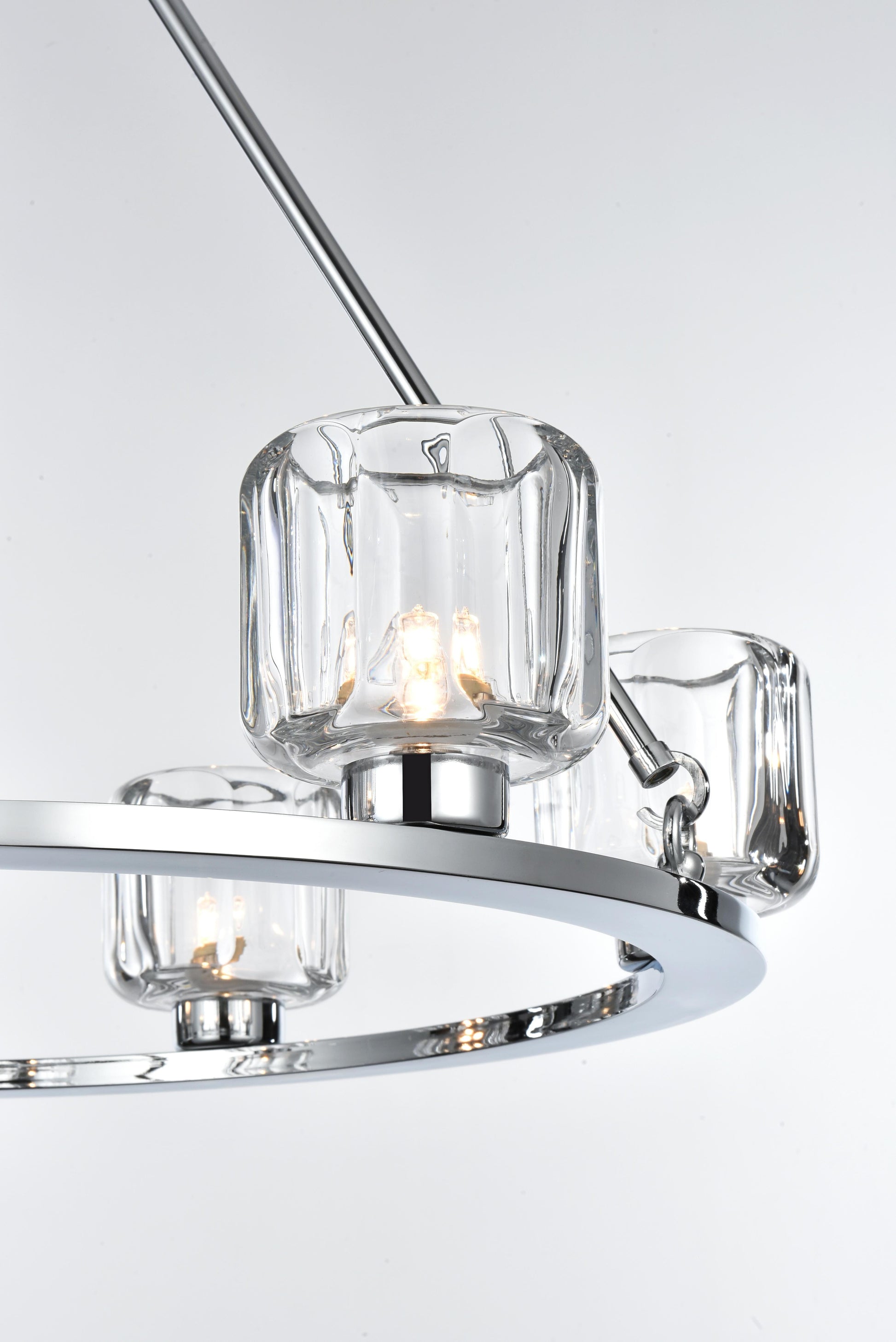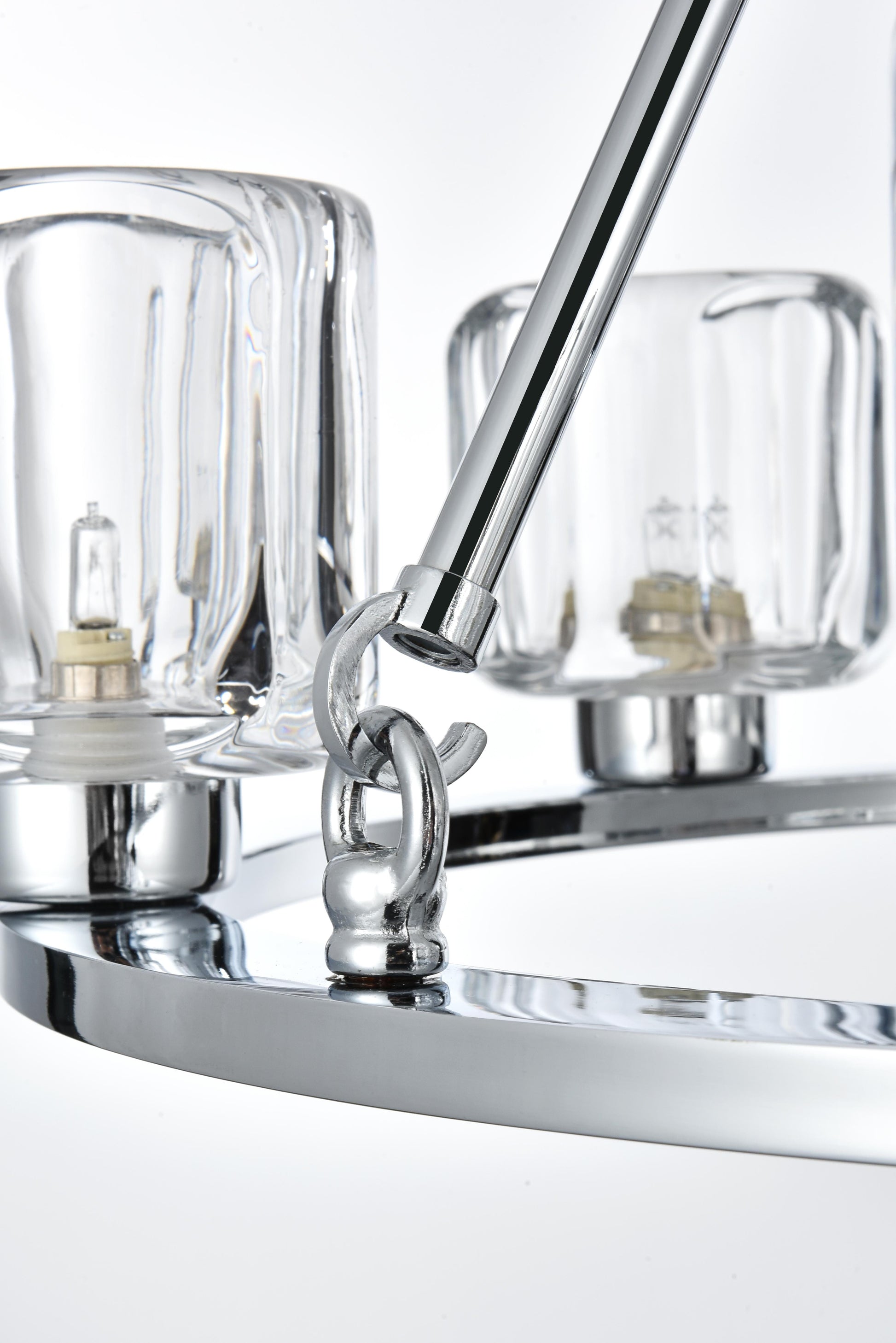 Add modern charm to your space with this striking chandelier, where a sleek circular iron frame meets sculpted clear glass shades. The unique design features decorative hanging rods with hooks, enhancing the structure with industrial flair. The clear glass refracts light beautifully, creating a radiant glow that uplights your space with warmth and dimension. Perfect for dining rooms, living rooms, or offices, this chandelier is available in black for a bold contrast, satin gold for a luxurious touch, and chrome for a sleek, modern vibe. With multiple size options and a matching canopy and chain for seamless installation, this dimmable chandelier offers both beauty and versatility. Light bulbs are not included, allowing you to choose the perfect style to match your vision.