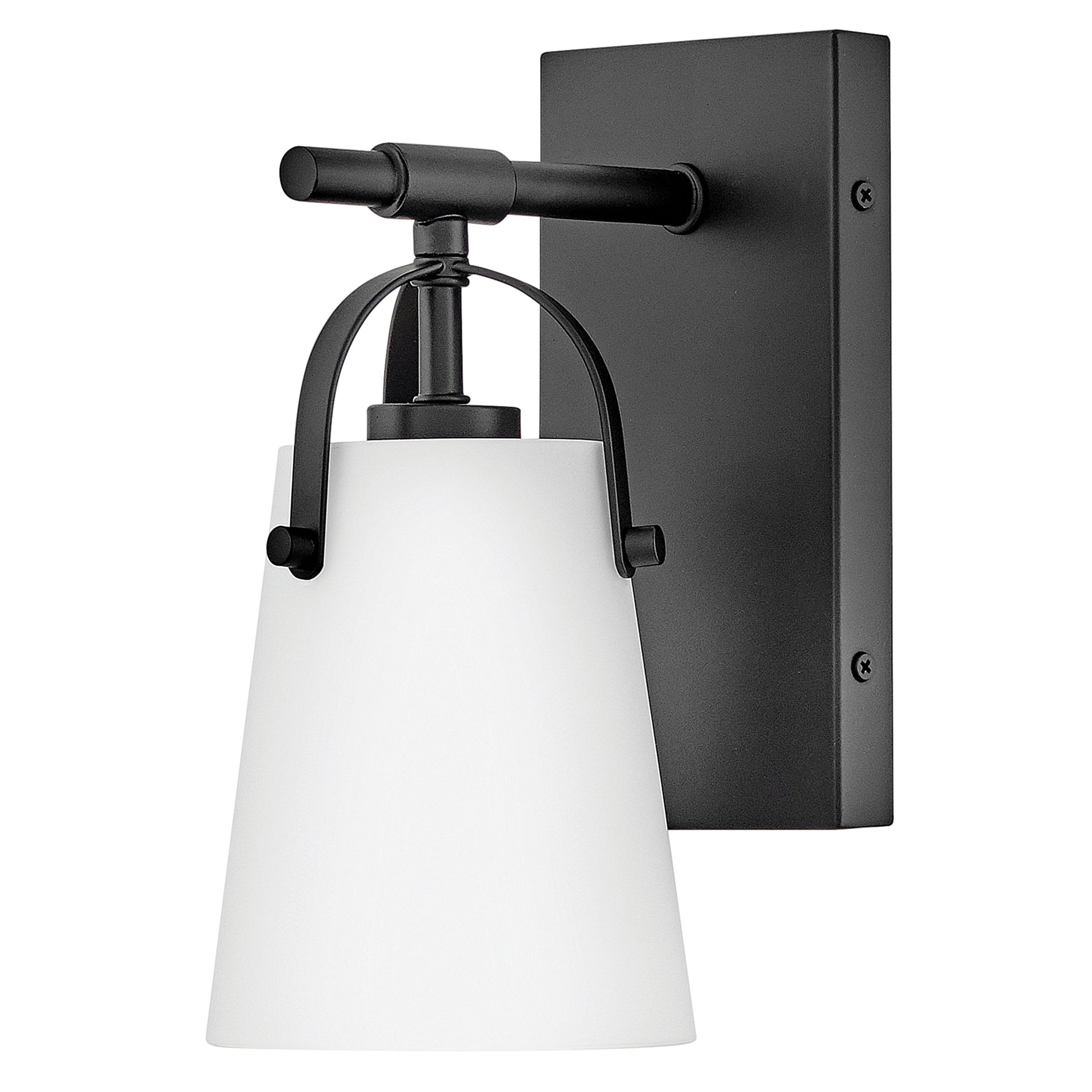 Clean and airy, Foster breathes composed simplicity into any bath space. Its softly tapered glass shade, suspended from arched handle prongs, creates a sophisticated transitional silhouette, enhanced by practical yet stylized details.
