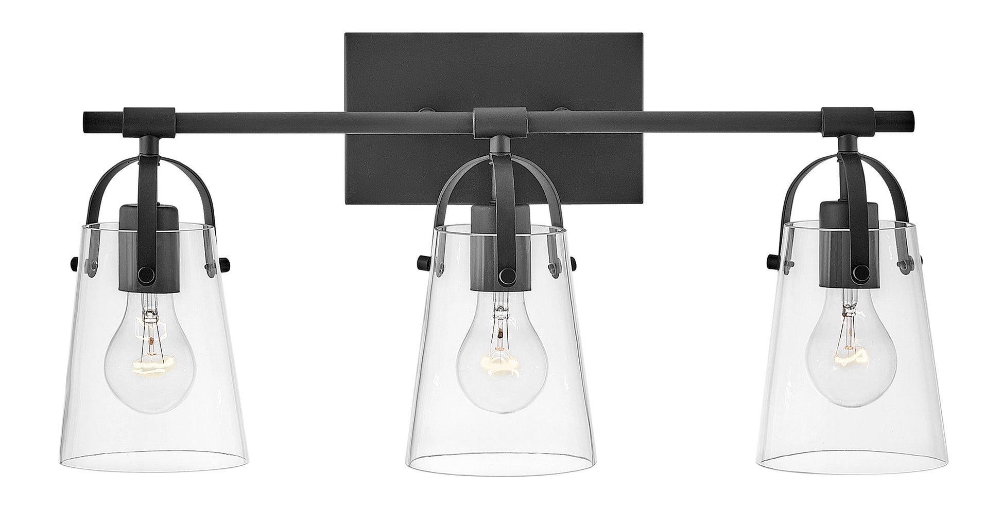 Clean and airy, Foster breathes composed simplicity into any bath space. Softly tapered glass shades suspended from arched handle prongs create a sophisticated transitional silhouette, enhanced by practical yet stylized details.